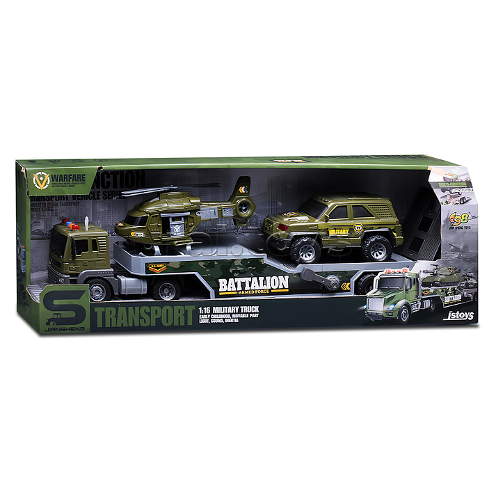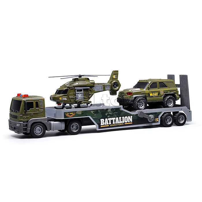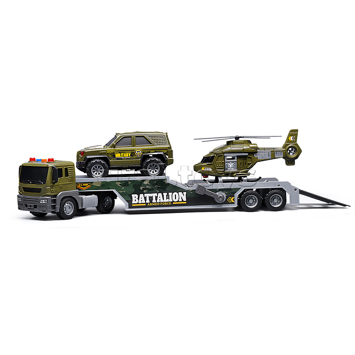 Наличие: >10 • Размеры автовоза: 43х10.5х9.5 см. • Функции автовоза: - инерционный механизм движения. - разматывающаяся лебёдка. - поднимающаяся платформа прицепа. - звук мотора. - звук работы. - звуковой сигнал. - мигание ламп. • Свет и звук работают от 3-х батареек "AG13" (входят в комплект для демонстрации) • В наборе: - джип с инерционным механизмом (18х9х8.5 см.) - вертолёт (21х7х9 см.) • У вертолёта вращается винт. • Материал: пластик. • Соответствует требованиям безопасности продукции. • Для детей от 3-х лет. Комментарии к товару