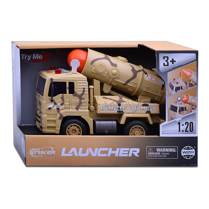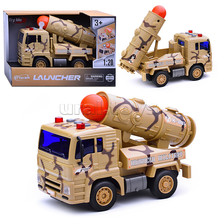Наличие: >10 • Размеры игрушки: 19х8х13 см. • Масштаб: 1/20. • Инерционный механизм движения. • Ракета поднимается и опускается (вручную) • 3 звуковые кнопки на крыше (звук работы, гудок, звук заднего хода) • При нажатии на кнопки горят фонари. • Свет и звук работают от 3-х батареек "AG13" (входят в комплект для демонстрации) • Материал: пластик. • Колёса с резиновыми покрышками. • Соответствует требованиям безопасности и качества продукции. • Для детей от 3-х лет. Комментарии к товару