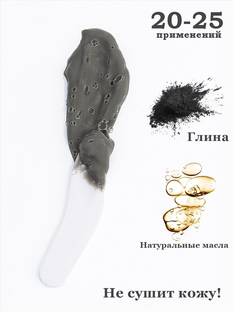 В упаковке вы найдете баночку с маской, герметично закрытую и имеющую защитную мембрану из пластика, а также пластиковую лопатку, которой удобно набирать средство. Распределять состав по коже лица все же удобнее пальцами. Сразу после нанесения маска начнет пениться. Вы можете ощутить легкое пощипывание, но без дискомфорта. Через несколько минут вся маска на лице превратится в густую серую пену.