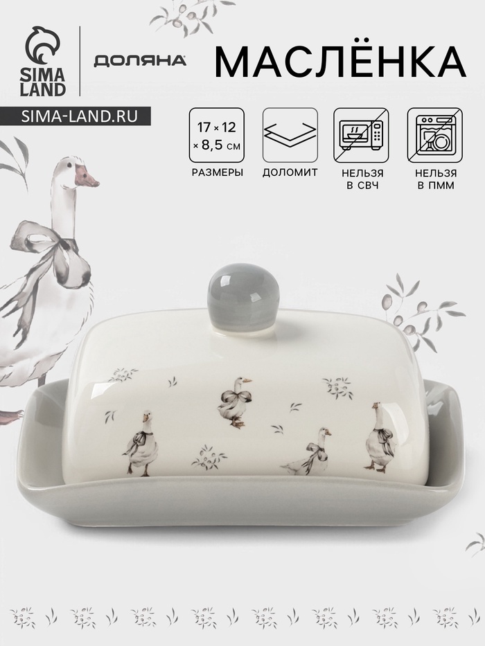 Эта маслёнка станет не только практичным предметом, но и элементом декора. Керамическая маслёнка с рисунком привнесет в ваш дом атмосферу уюта и тепла. Маслёнка «Гуси» Доляна - отличный выбор для создания особенной атмосферы на вашей кухне.