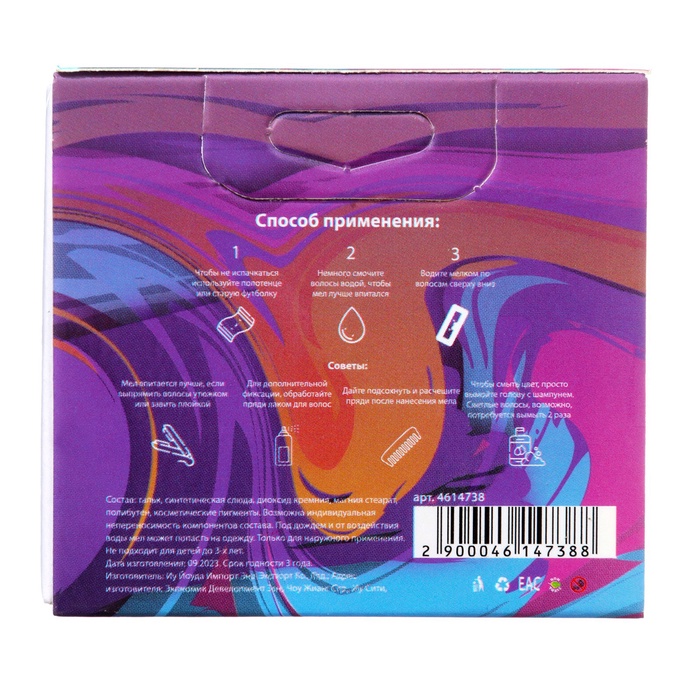Габариты: 6,5 x 6,5 x 1,5; Доставка: Платная; Страна: Китай; В боксе: 240 набор; Состав: См. на упаковке; Материалы: см. на упаковке; Фасовка: по 1 набор; Индивидуальная упаковка: Картонная коробка; Габариты товара: 6 см × 6 см × 1,5 см; Сертификат: ЕАС; Набор: Да; Цвет: МИКС; Для кого: Для девочки, Унисекс; Тематика праздника: День рождения, День защиты детей, 1 Сентября, 8 Марта, Универсальная тематика; Составляющие набора: Мел для волос; Количество цветов в наборе: 4