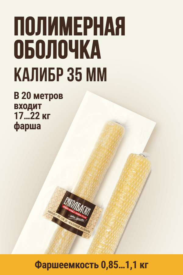Производитель: ИП Агапкин ПА; Вид оболочки: гофрированная прямая полимерная оболочка.; Материал: мембранный полимер.; Количество в упаковке: 20 метров.; Калибр оболочки: 35 мм.; Фаршеемкость: в 1 м - 0,85…1,1 кг. В 20 метрах этой оболочки поместится от 17 до 22 кг фарша.; Цвет: бесцветная.; Виды колбас: сардельки, сырокопченые колбаски, варено-копченая колбаса, копчено-вареная колбаса, сыровяленая колбаса, кровяная колбаса, ливерная колбаса.; Режим приготовления: проницаемая, устойчива к продолжительному копчению при t=80…85 град.; Способ приготовления: вяление, варка, копчение, запекание.; Температурный режим приготовления: не выше 80 град.; Подготовка к набивке: НЕ ЗАМАЧИВАТЬ! Оболочка готова к набивке.; Условия и сроки хранения: хранить при t = 15…25 град. и отн.влажности 65…75% - 36 мес.
