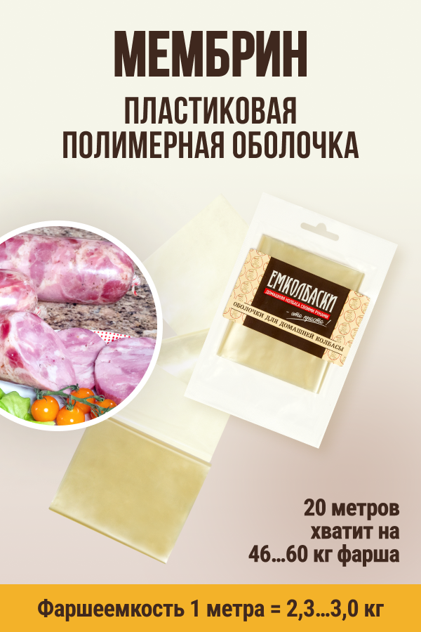 Производитель: ИП Агапкин ПА; Вид оболочки: мембранная полимерная оболочка.; Материал: полимерная мембранная пленка.; Количество в упаковке: 20 метров; Фаршеемкость: в 1 м - 2,3...3 кг. В 20 метрах этой оболочки поместится от 46 до 60 кг фарша.; Цвет: бесцветная.; Виды колбас: вареная колбаса, рулет, рубленая колбаса, сыровяленая колбаса, кровяная колбаса, докторская, варено-копченая колбаса, копчено-вареная колбаса, сырокопченая колбаса, зельц.; Способ приготовления: вяление, варка, копчение, запекание.; Температурный режим приготовления: не выше 80 град.; Подготовка к набивке: перед использованием оболочку следует замочить на 5-10 минут в теплой воде.; Условия и сроки хранения: хранить при t = 15…25 град. и отн. влажности 65…75% - 36 мес.