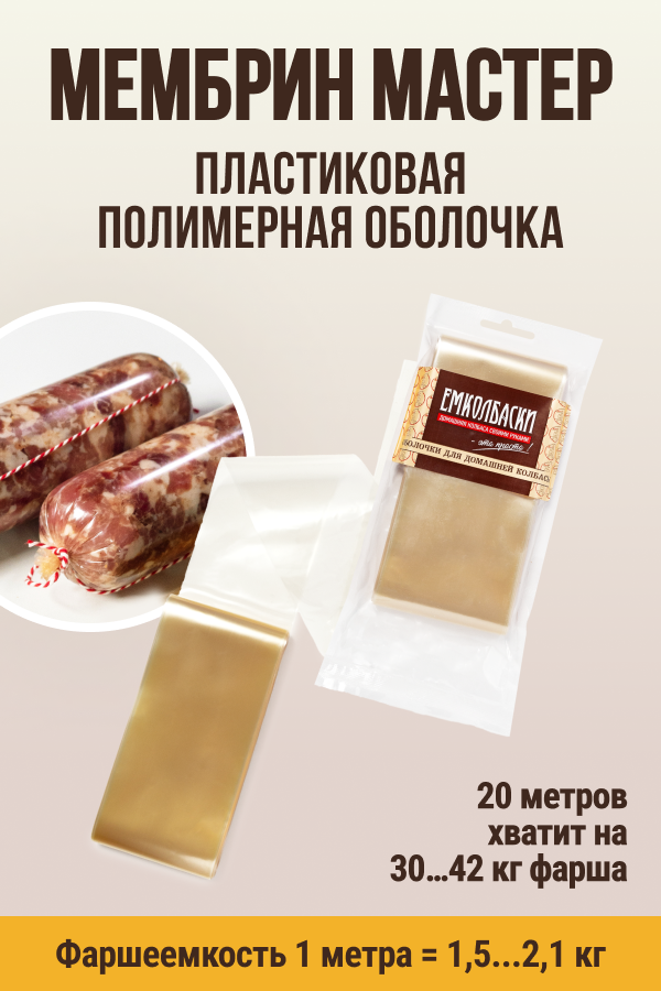 Производитель: ИП Агапкин ПА; Вид оболочки: мембранная полимерная оболочка.; Материал: полимерная мембранная пленка.; Количество в упаковке: 20 метров.; Калибр оболочки: 50 мм.; Фаршеемкость: в 1 м - 1,5 ... 2,1 кг. В 20 метрах этой оболочки поместится от 30 до 42 кг фарша.; Цвет: бесцветный.; Виды колбас: сервелат, салями, сыровяленная колбаса, краковская, ливерная колбаса, кровяная колбаса, варено-копченая колбаса, копчено-вареная колбаса, сырокопченая колбаса, колбасы в плесени.; Способ приготовления: варка, копчение, вяление, запекание.; Температурный режим приготовления: не выше 80 град.; Подготовка к набивке: перед использованием оболочку можно замочить на 5-10 минут в теплой воде.; Условия и сроки хранения: хранить при t = 15…25 град. и отн.влажности 65…75% - 36 мес.