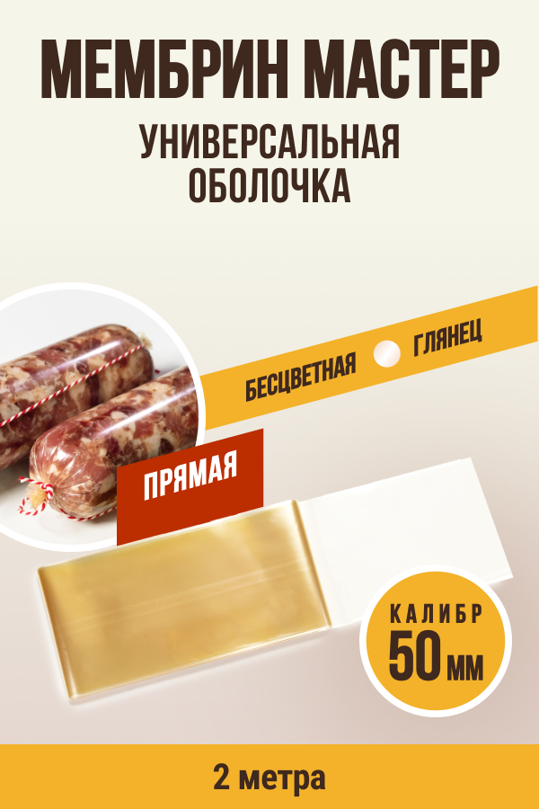 Производитель: ИП Агапкин ПА; Вид оболочки: мембранная полимерная оболочка.; Материал: полимерная мембранная пленка.; Количество в упаковке: 2 метра.; Калибр оболочки: 50 мм.; Фаршеемкость: в 1 м - 1,5 ... 2,1 кг. В 2 метрах этой оболочки поместится от 3 до 4,2 кг фарша.; Цвет: бесцветный.; Виды колбас: сервелат, салями, сыровяленная колбаса, краковская, ливерная колбаса, кровяная колбаса, варено-копченая колбаса, копчено-вареная колбаса, сырокопченая колбаса, колбасы в плесени.; Способ приготовления: варка, копчение, вяление, запекание.; Температурный режим приготовления: не выше 80 град.; Подготовка к набивке: перед использованием оболочку можно замочить на 5-10 минут в теплой воде.; Условия и сроки хранения: хранить при t = 15…25 град. и отн.влажности 65…75% - 36 мес. МЕМБРИН МАСТЕР калибр 50 мм, прямая универсальная оболочка, бесцветная - 2 метра В упаковке - 2 метра. Тип оболочки - глянцевая. Вся оболочка прямая. Блеск глянцевой оболочки придает батону свежий и нарядный вид. Фаршеемкость этой оболочки в калибре 50 мм - 1,5...2,1 кг в 1 метре. Внимание! Оболочка не съедобна! Ее нельзя прокалывать. Перед использованием оболочку можно замочить на 5-10 минут в теплой воде для придания ей большей эластичности, а можно набивать в нее и без замачивания. Перед использованием оболочку порежьте на отрезки нужной длины (представьте какой длины вы хотите видеть один батон колбасы, а затем замочите или набивайте сразу). Оболочка МЕМБРИН – новая оболочка в России, относится к разряду "умных" оболочек. В чем особенности этой оболочки? Специальный полимер, который пропускает водяной пар и дым внутрь и не выпускает обратно. Другими словами оболочка МЕМБРИН универсальная для всех видов колбас с различными способами доведения до готовности изделия. В МЕМБРИНе можно вялить колбасы без специальной климатической камеры, в МЕМБРИНе можно колбасы и коптить, и варить, и сушить. * МЕМБРИН отлично чистится с колбасного батона, оставляя глянцевую красивую поверхность (при соблюдении рекомендуемых режимов термообработки, особенно правильно проведенный этап ОБСУШКА). * МЕМБРИН не имеет натуральных компонентов животного происхождения и  подходит всем религиозным конфессиям. * МЕМБРИН практически не портится при хранении (при соблюдении рекомендуемых условий хранения). * Все виды колбас, кроме жареных колбасок и купат, готовятся при температуре не выше 80 град. При температурах не выше 100 град. полимер, из которого сделана оболочка абсолютно безопасен, не выделяет вредных веществ. Смотреть рецепт с использованием этого товара: * Мастер-класс - Какие стартовые культуры, специи, варианты соли и оболочки нужны для вяления (YouTube, Дзен, RUTUBE) * Сервелат в праздничной оболочке (YouTube, Дзен) Смотреть ролик. Обзор всех видов оболочек из серии МЕМБРИН с разбором какие оболочки подходят больше для копчения, а какие для вяления.