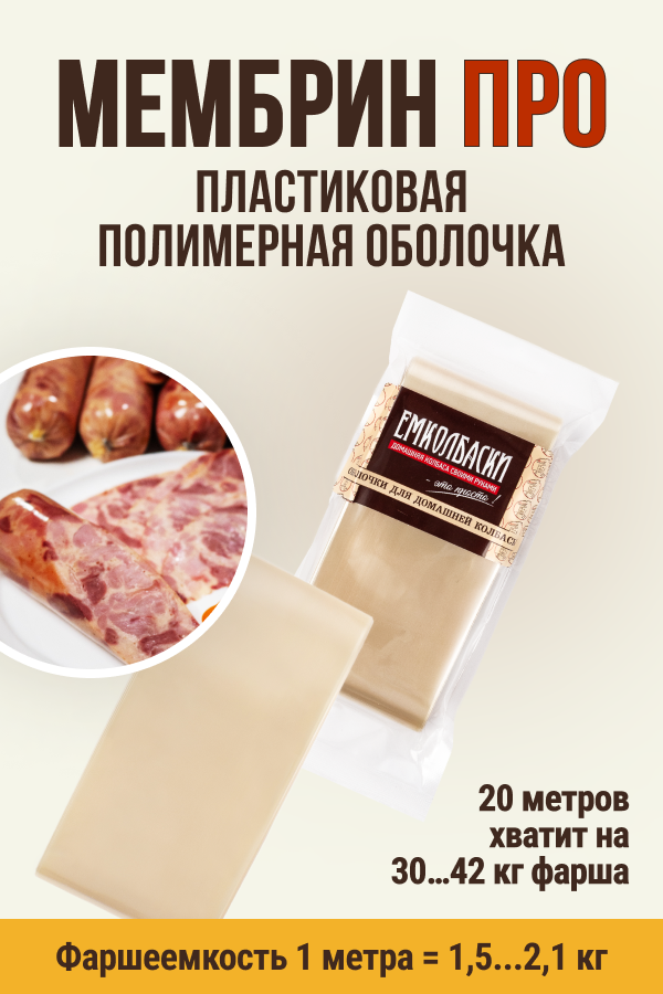 Производитель: ИП Агапкин ПА; Вид оболочки: мембранная полимерная оболочка.; Материал: полимерная мембранная пленка.; Количество в упаковке: 20 метров; Калибр оболочки: 50 мм; Фаршеемкость: в 1 м - 1,5 ... 2,1 кг. В 20 метрах этой оболочки поместится от 30 до 42 кг фарша.; Цвет: бесцветная.; Виды колбас: сервелат, салями, сыровяленная колбаса, краковская, ливерная колбаса, кровяная колбаса, варено-копченая колбаса, копчено-вареная колбаса, сырокопченая колбаса.; Способ приготовления: вяление, варка, копчение, запекание.; Температурный режим приготовления: не выше 80 град.; Подготовка к набивке: перед использованием оболочку следует замочить на 5-10 минут в теплой воде.; Условия и сроки хранения: хранить при t = 15…25 град. и отн.влажности 65…75% - 36 мес.