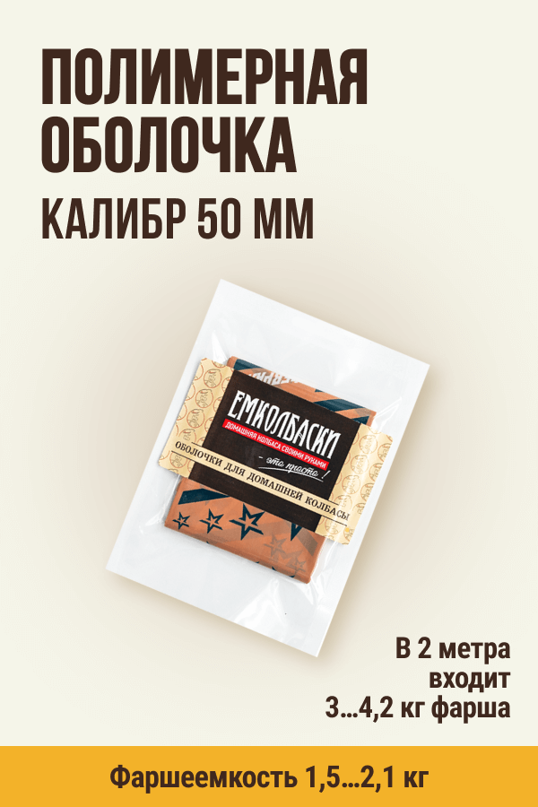 Производитель: ИП Агапкин ПА; Вид оболочки: мембранная полимерная оболочка.; Материал: полимерная мембранная пленка.; Количество в упаковке: 2 метра.; Калибр оболочки: 50 мм.; Фаршеемкость: в 1 м - 1,5 ... 2,1 кг. В 2 метрах этой оболочки поместится от 3 до 4,2 кг фарша.; Цвет: копчение с нанесенным рисунком.; Виды колбас: варено-копченая колбаса, копчено-вареная колбаса, вареная колбаса.; Способ приготовления: варка, копчение, запекание.; Температурный режим приготовления: не выше 85 град.; Подготовка к набивке: перед использованием оболочку следует замочить на 5-10 минут в теплой воде.; Условия и сроки хранения: хранить при t = 15…25 град. и отн.влажности 65…75% - 36 мес.