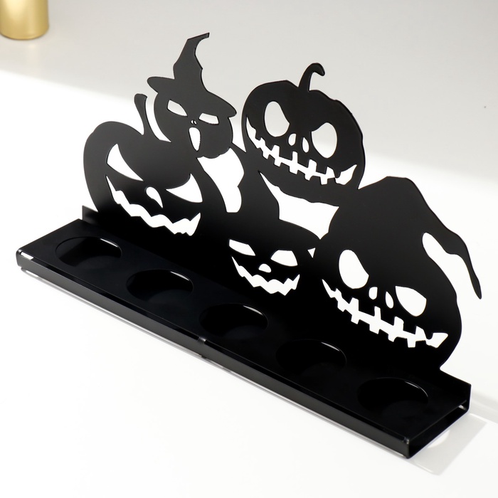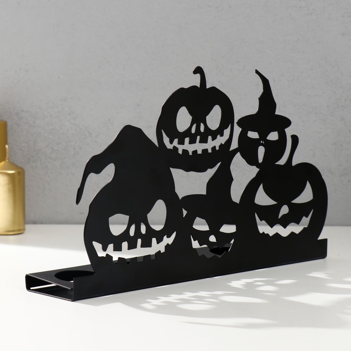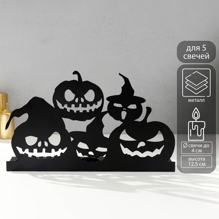Габариты: 31 x 27 x 3; Страна: Китай; В боксе: 12 шт; Состав: Металл; Материалы: металл; Фасовка: по 1 шт; Индивидуальная упаковка: Картонная коробка; Габариты товара: 29,5 см × 6 см × 12,5 см; Сертификат: Не подлежит сертификации; Набор: Нет; Цвет: Чёрный; Высота, см: 12,5; Диаметр под свечу, см: 4; Количество рожков: 5; Тематика праздника: Хэллоуин, Универсальная тематика; Материал: Металл; Свеча в комплекте: Нет