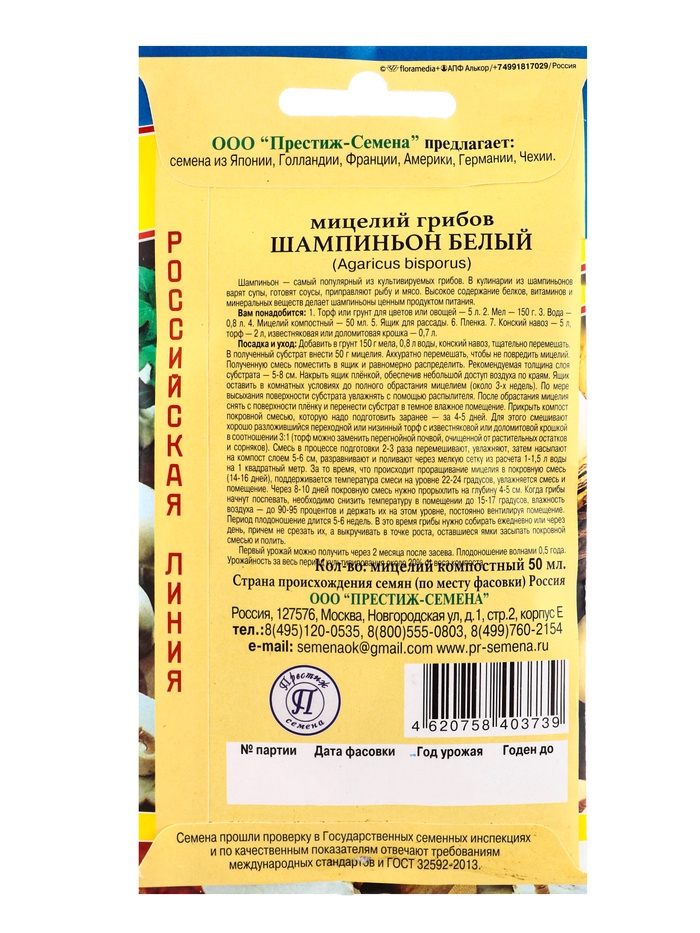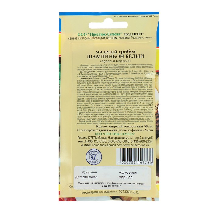 Производитель: Престиж семена; Габариты: 0,1 x 8 x 15; Страна: Россия; В боксе: 250 шт; Состав: Семена; Материалы: семена; Фасовка: по 5 шт; Индивидуальная упаковка: Без упаковки; Сертификат: Не подлежит сертификации; Место выращивания: Открытый грунт, Универсальный; Вид: Шампиньоны