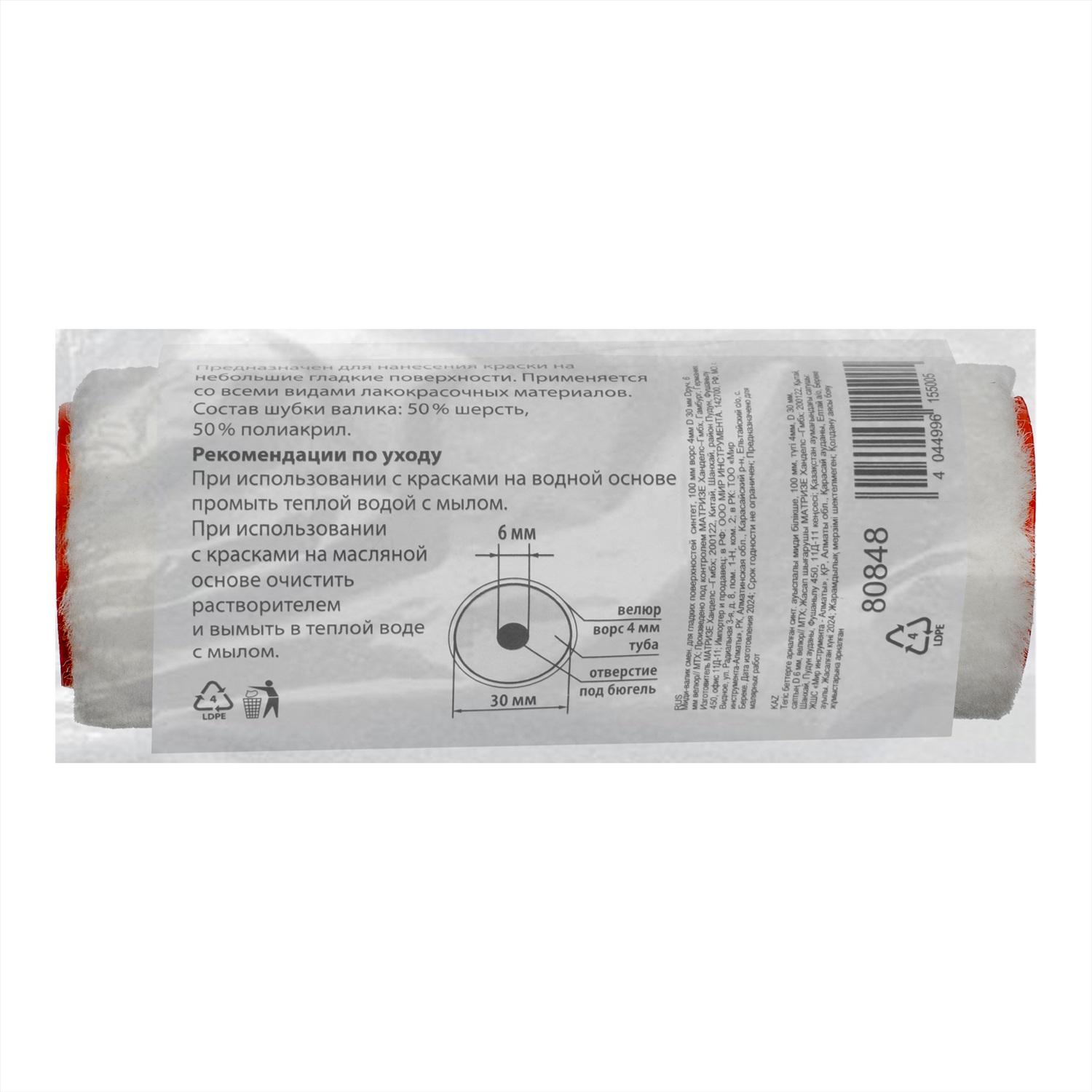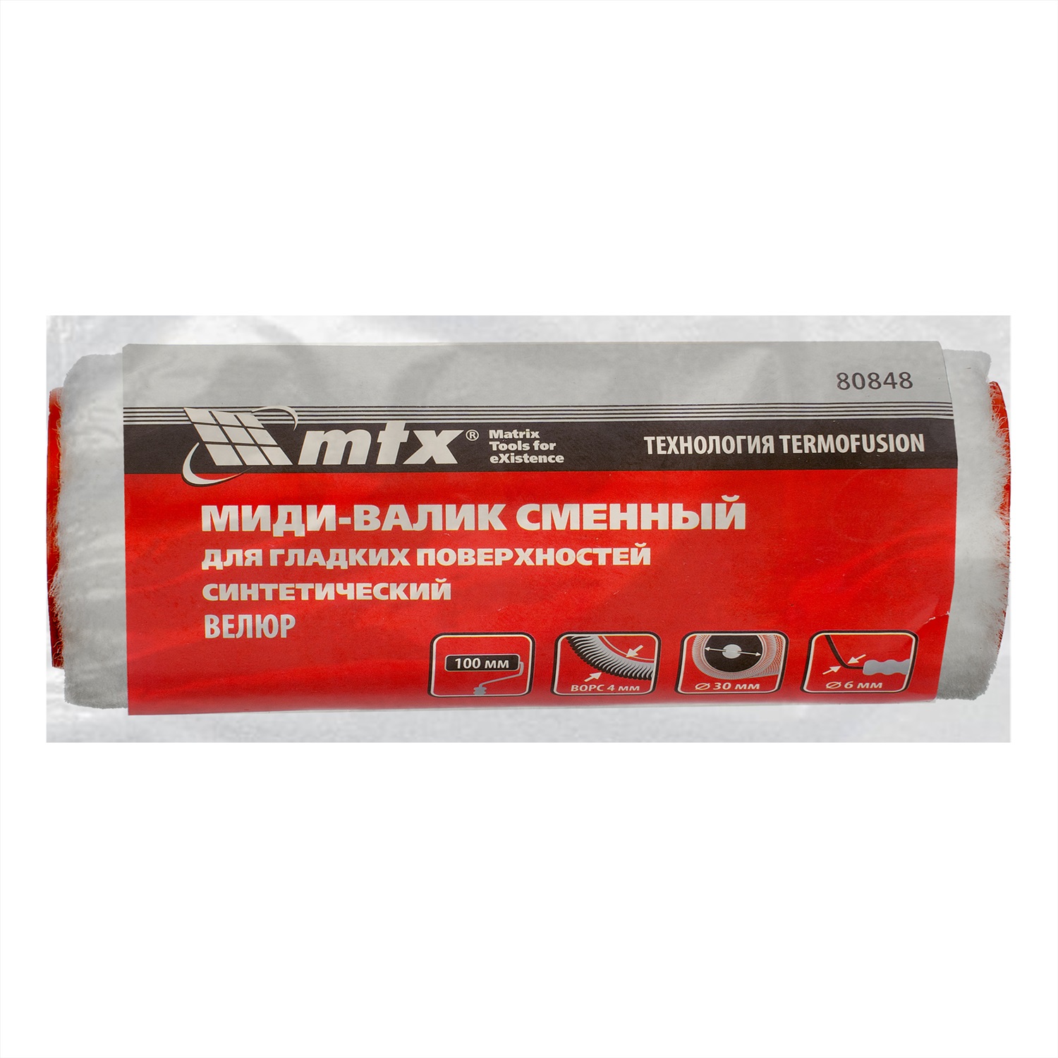 Сменный синтетический миди-валик для гладких поверхностей MTX 80848 шириной 100 мм и диаметром 30 мм, с шубкой из велюра, ворсом 4 мм, под ручку 6 мм, используется для финишной отделки на небольших участках и в труднодоступных местах. Благодаря короткому ворсу лакокрасочный состав равномерно наносится тонким слоем, поэтому валик оптимален для работы с лаками.