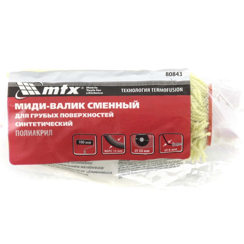 Сменный синтетический миди-валик для грубых поверхностей MTX 80843 с ворсом из полиакрила 12 мм, шириной 100 мм, диаметром ролика 30 мм, подходит для бюгелей диаметром 6 мм. Шубка с ворсом из полиакрила качественно прокрашивает неровные поверхности. Валиком удобно работать на небольших участках и в труднодоступных местах. Преимущества