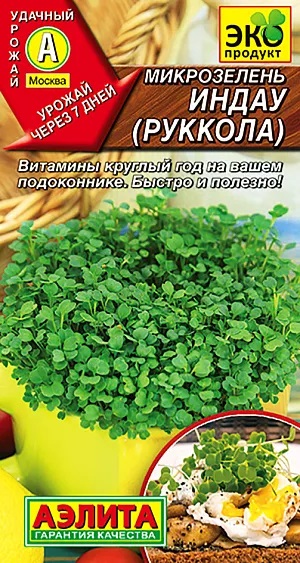 Зелень очень нежная и душистая, с пряным орехово-горчичным вкусом. Является природным источником йода и витамина С, способствует выведению холестерина и повышению уровня гемоглобина, укрепляет стенки кровеносных капилляров. Растет быстро и дружно. В пищу используют стебли и листья молодых растений . Микрозелень Руккола-незаменимая добавка к мясным, рыбным блюдам и салатам. Состав: семена индау (рукколы) Чудесница ®