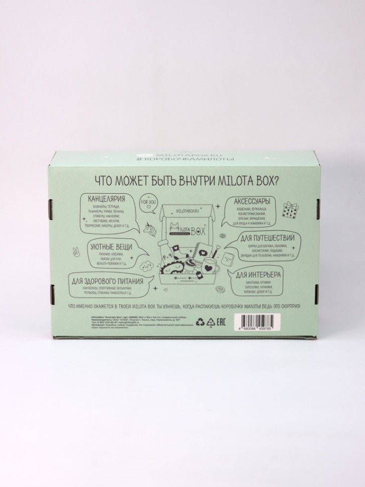 Каждая коробочка милоты наполнена необычными вещицами, которыми будет приятно пользоваться в повседневной жизни: милая канцелярия, уютные товары для дома, стильные аксессуары, предметы для здорового образа жизни и приятные мелочи. Наполнение MilotaBox стало ещё лучше! Больше подарков! Внутри каждого MilotaBox находится до 13 предметов на одну тематику, упакованных в стилизованную бумагу тишью. Коробочка из плотного, дизайнерского картона. Размер коробочки: 28,5 х 18,5 х 9,5 см. Общий вес: 900 гр.