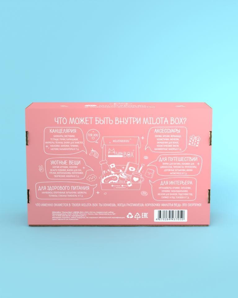Наш бренд: Milota BOX Страна производства: Россия Штрихкод: 4670284437050 Размер упаковки, см: 18.5 × 28.5 × 9.5 Материал: Коробка, набор подарков Глубина, см: 9,5 Ширина, см: 28,5 Высота, см: 18,5 Каждая коробочка милоты наполнена необычными вещицами, которыми будет приятно пользоваться в повседневной жизни: милая канцелярия, уютные товары для дома, стильные аксессуары, предметы для здорового образа жизни и приятные мелочи. Наполнение MilotaBox стало ещё лучше! Больше подарков! Внутри каждого MilotaBox находится до 13 предметов на одну тематику, упакованных в стилизованную бумагу тишью. Коробочка из плотного, дизайнерского картона. Размер коробочки: 28,5 х 18,5 х 9,5 см. Общий вес: 900 гр. Комментарии к товару