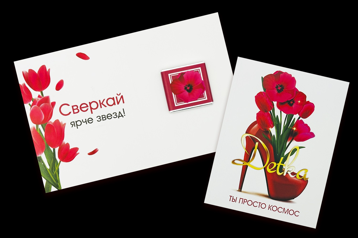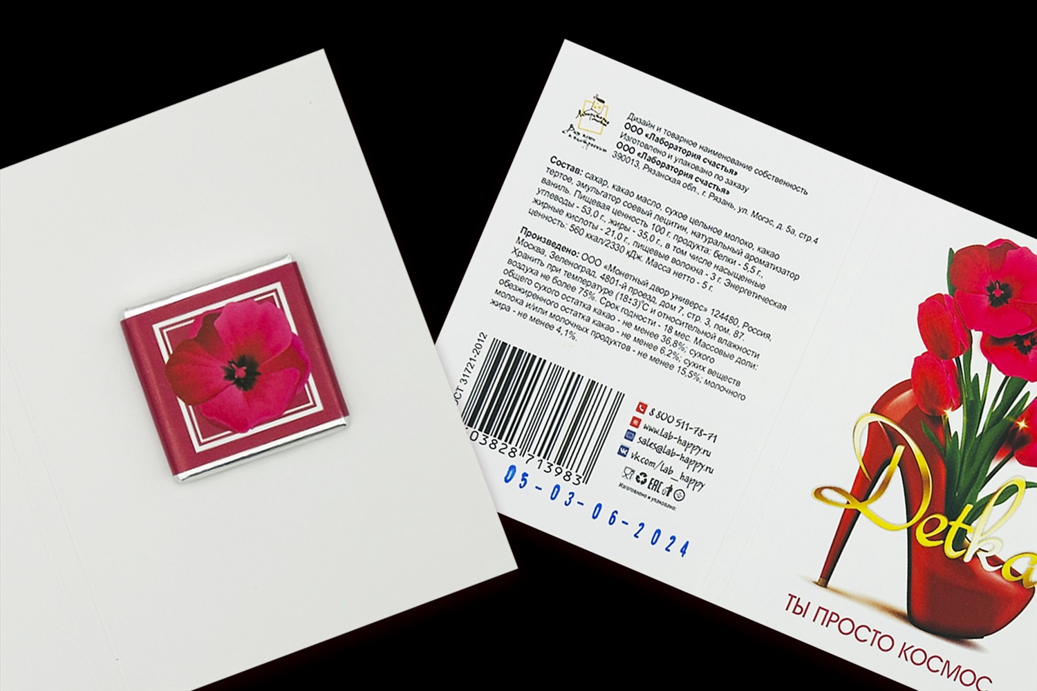 Внутри открытки 1 вкуснейшая молочная плитка шоколада 5гр. размером 31х31мм. Завернута в индивидуальную упаковку под тематику открытки. Состав: сахар, какао масло, сухое цельное молоко, какао тертое, эмульгатор соевый лецитин, натуральный ароматизатор ваниль.