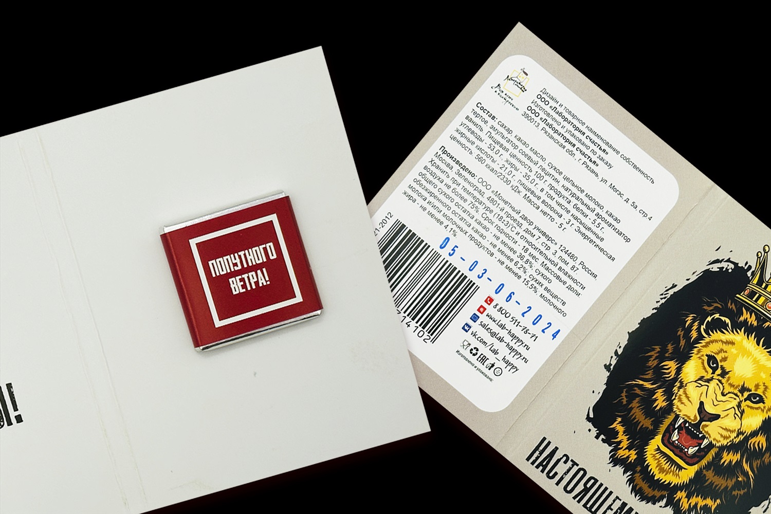 Внутри открытки 1 вкуснейшая молочная плитка шоколада 5гр. размером 31х31мм. Завернута в индивидуальную упаковку под тематику открытки. Состав: сахар, какао масло, сухое цельное молоко, какао тертое, эмульгатор соевый лецитин, натуральный ароматизатор ваниль.