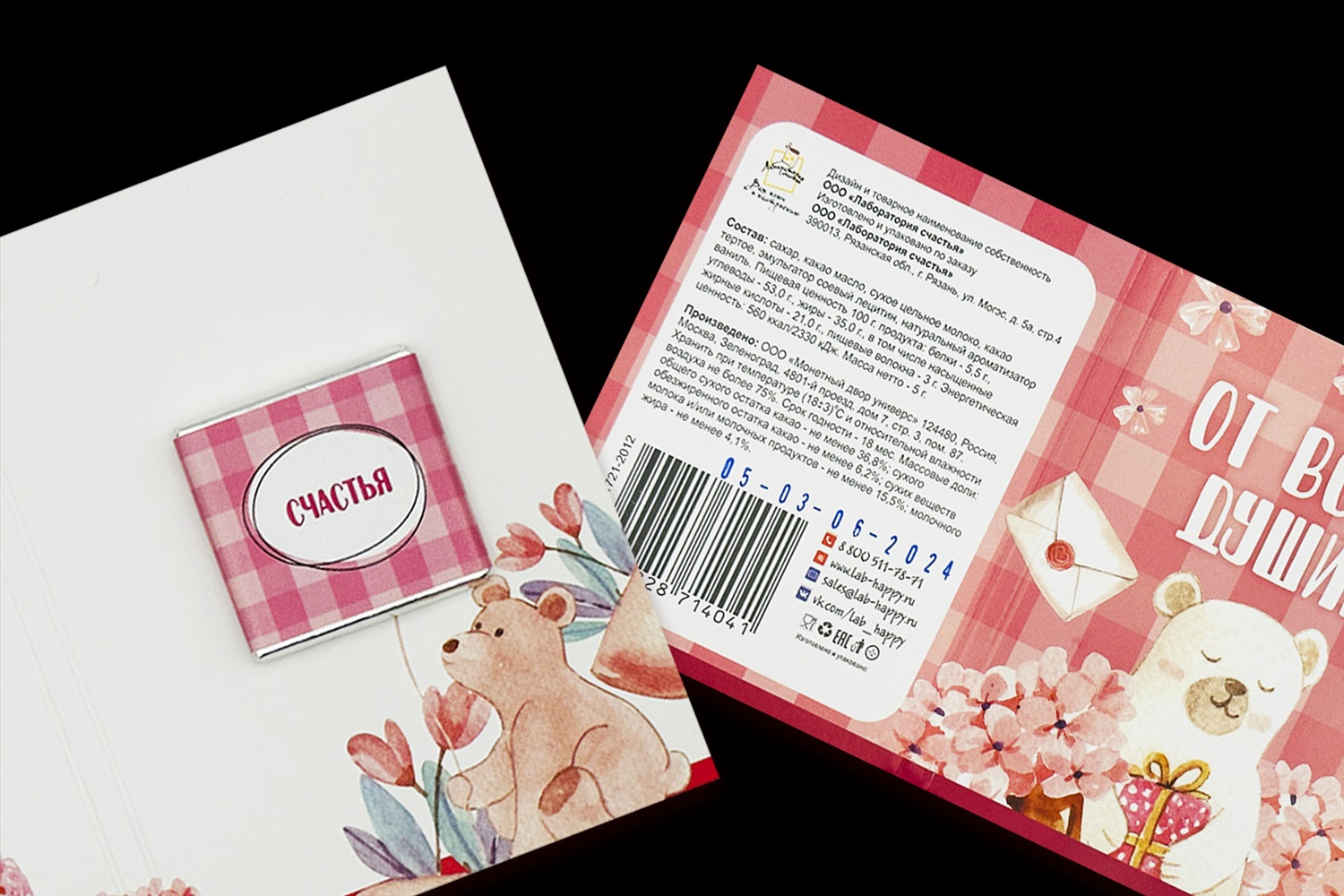 Внутри открытки 1 вкуснейшая молочная плитка шоколада 5гр. размером 31х31мм. Завернута в индивидуальную упаковку под тематику открытки. Состав: сахар, какао масло, сухое цельное молоко, какао тертое, эмульгатор соевый лецитин, натуральный ароматизатор ваниль.