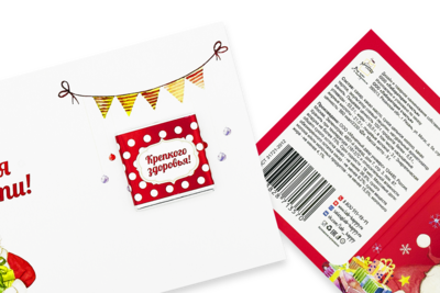 Внутри открытки 1 вкуснейшая молочная плитка шоколада 5гр. размером 31х31мм. Завернута в индивидуальную упаковку под тематику открытки. Состав: сахар, какао масло, сухое цельное молоко, какао тертое, эмульгатор соевый лецитин, натуральный ароматизатор ваниль.