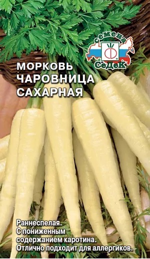 Семена морковь Чаровница сахарная. Раннеспелый (от всходов до технической спелости 70-90 дней) сорт моркови. Корнеплоды крупные конические, заостренные, выровненные, длиной 20-25 см, необычного светящегося кремово-белого цвета, с тонкой кожицей. Мякоть и сердцевина белые, плотные, ароматные, сладкие. Имеет повышенное содержание калия, благоприятно влияющего на работу сердца, сосудов и почек. Содержание каротина меньше, чем в корнеплодах с оранжевой кожурой, поэтому рекомендуется для диетического и детского питания.