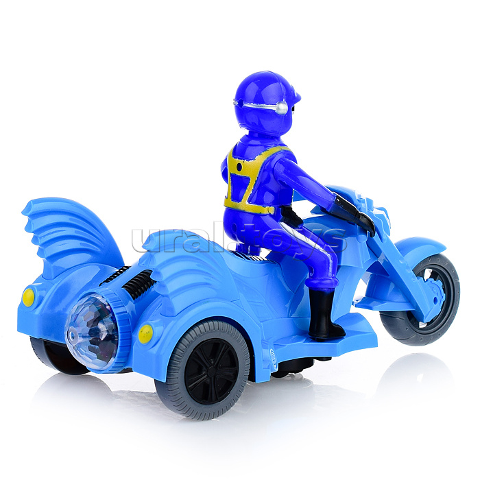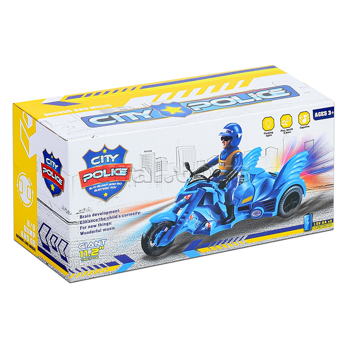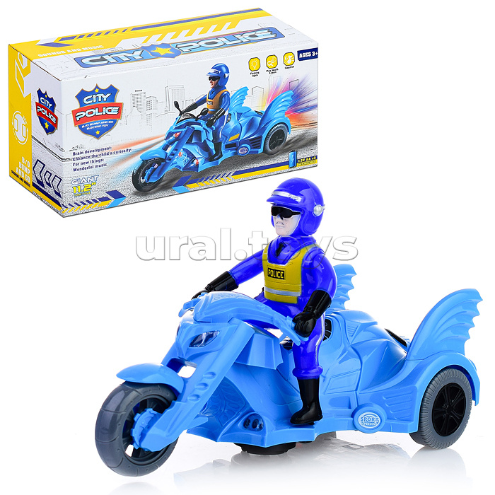 Движется в случайном направлении, вращается. Разноцветная подсветка, звуки клаксона и сирены. Работает от 3-х батареек «АА» (не входят в комплект). Размеры: 28 х 13 х 17 см. Материал: пластик. Для детей от 3-х лет. Соответствует требованиям безопасности продукции.