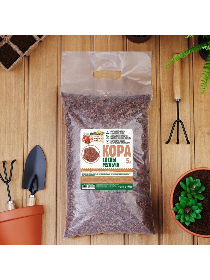 Кора сосны "Рецепты Дедушки Никиты" может использоваться как субстрат для выращивания растений в горшках, контейнерах или грунте, а также как мульча для укрытия почвы в саду или огороде. В обоих случаях она помогает сохранить оптимальные условия для роста растений, защищая корни от перегрева, переохлаждения и пересыхания. Кроме того, кора сосны предотвращает развитие сорняков, что уменьшает необходимость вручную пропалывать грядки.