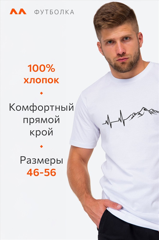 Лаконичный рисунок Кардиограмма в виде гор — главный акцент, который станет центром любого образа. Хлопковая футболка с принтом выполнена из легкой трикотажной ткани кулирная гладь. Сочетание мягкости и прочности позволяет ей сохранять форму даже после многократных стирок.