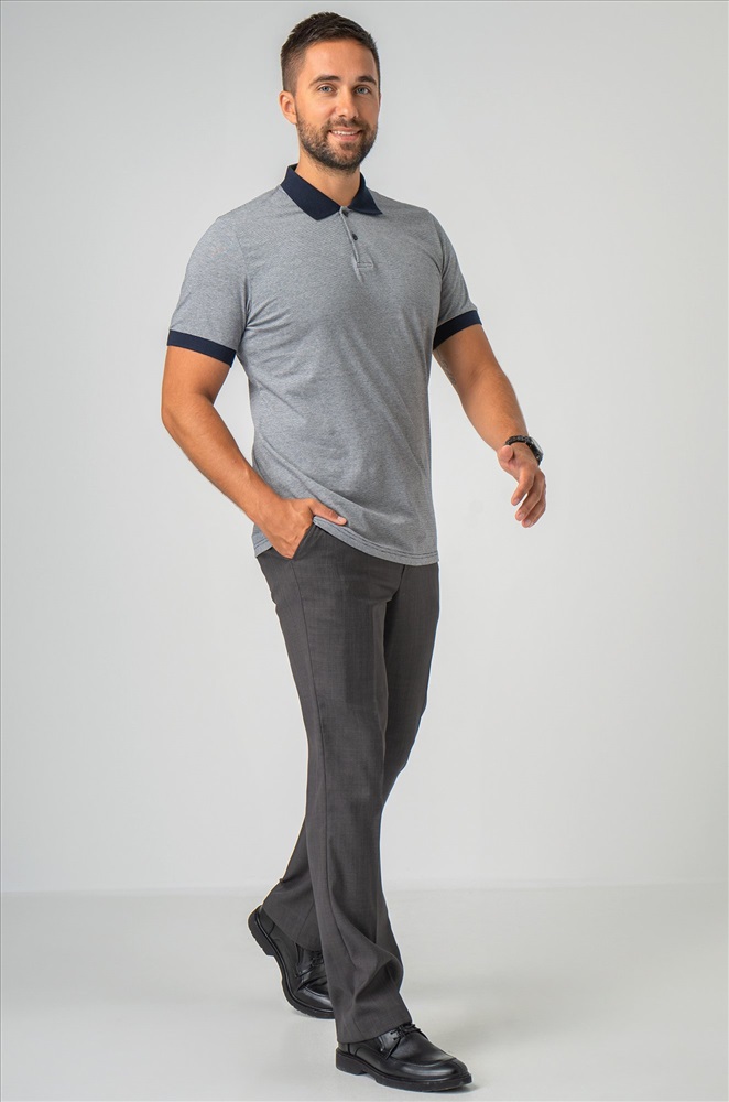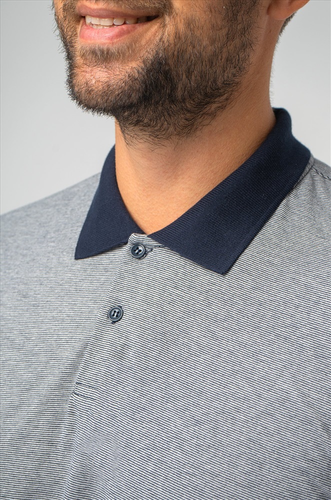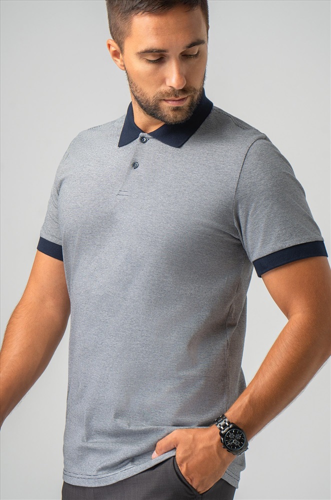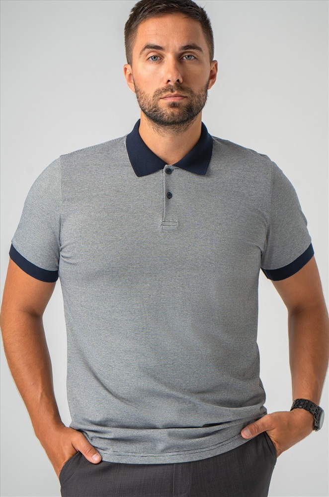 Мужское поло из натурального 100% хлопка – идеальное решение для любой ситуации. Темно-синяя футболка для мужчин поможет создать брутальный кэжуал образ благодаря стильному сочетанию деталей. Летнее поло дополнено контрастным отложным воротником, отделкой на рукавах и рисунком в тонкую полоску.