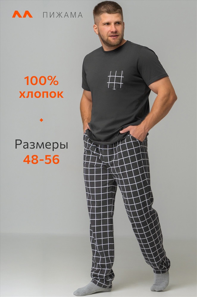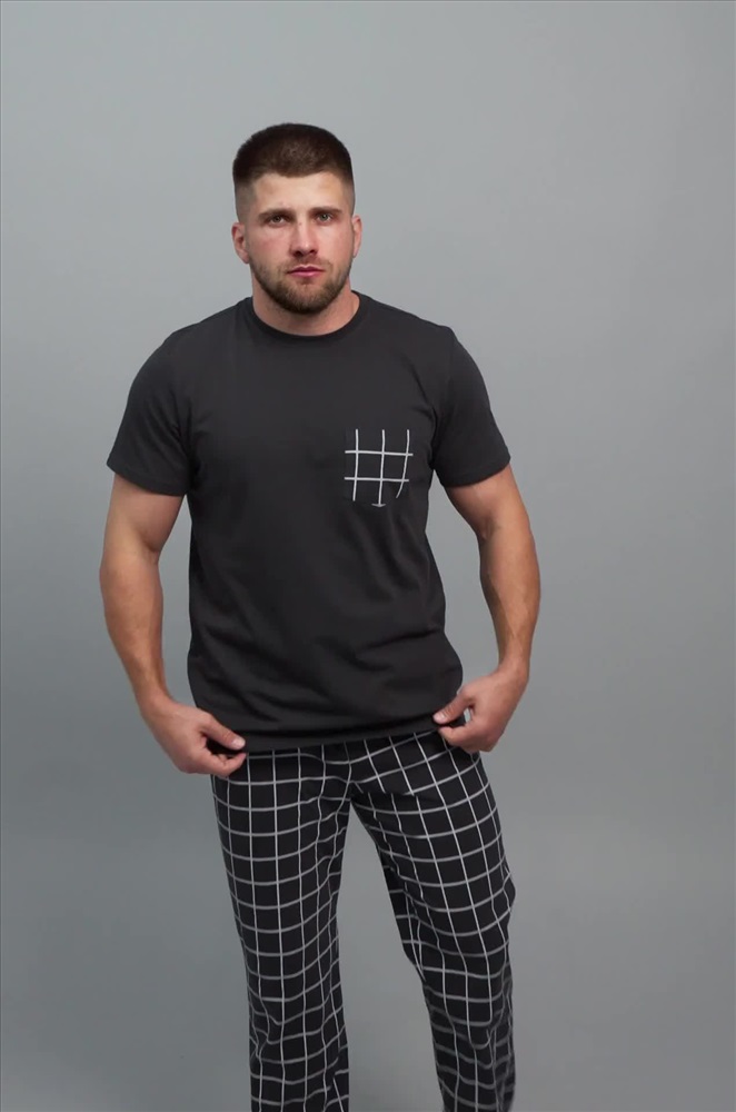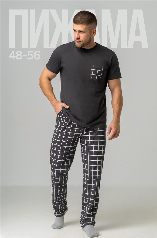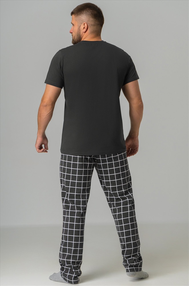 Мужская пижама с брюками выполнена из хлопкового трикотажа кулирная гладь. Удобный клетчатый костюм для дома, в который входят футболка с коротким рукавом и прямые брюки на эластичной резинке. На груди предусмотрен накладной карман.