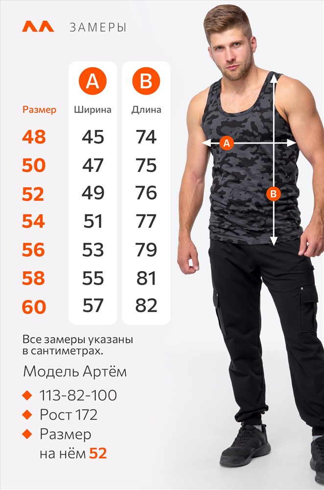 Модель Артем, его рост 172 см, параметры 113-82-100 см. На нем серая камуфляжная майка 52 размера.