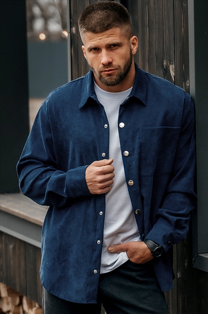 Мужская синяя рубашка из мягкого вельвета – отличный способ подчеркнуть свою индивидуальность. Свободный крой подарит уют и комфорт, а карман на груди и застежка на металлические кнопки добавят стильную изюминку в образ. Однотонная вельветовая рубашка с удлиненной спинкой идеальна для прохладной весны и зябкой осени.