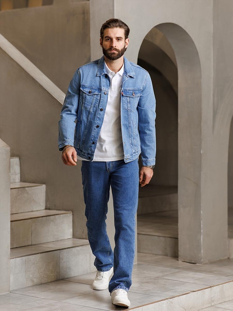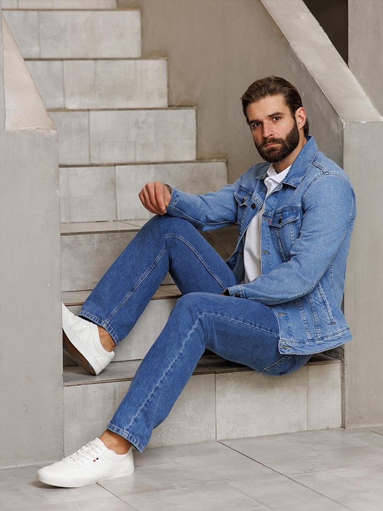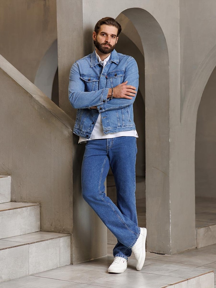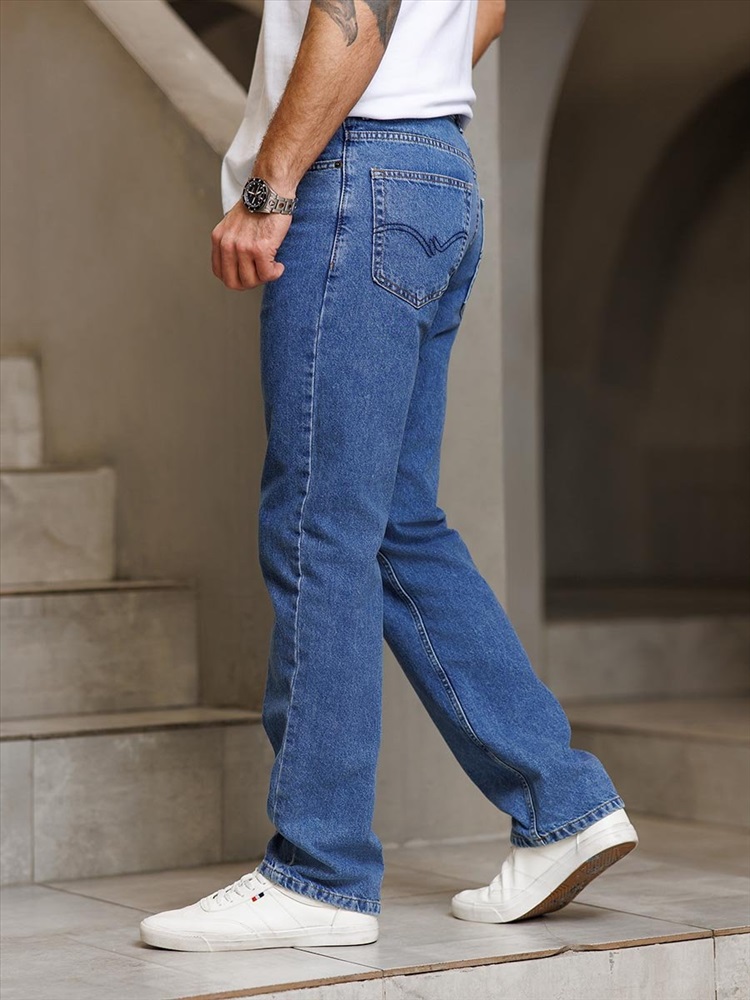 Мужские классические джинсы с пятью карманами. Посадка Regular fit (полуоблегающие по бедру), высокая талия. Застежка на молнии. Немного заужены в колене и по низу . Выполнены из толстой ткани denim. Средняя стирка с потёртостями и "усами" спереди и потёртостями сзади.