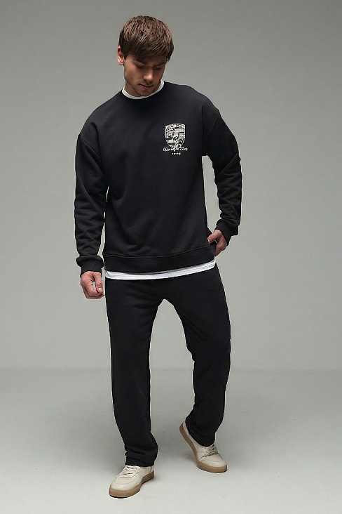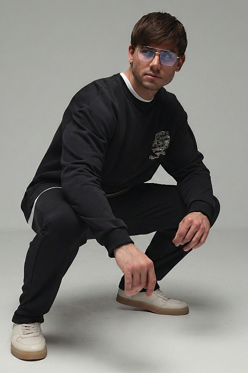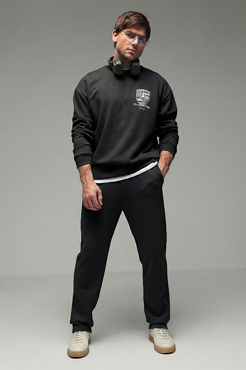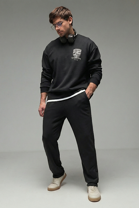Мужской костюм с брюками из футера трёхнитки — это комплект из толстовки и брюк, изготовленный из плотной трикотажной ткани, которая состоит из трёх нитей. Такой материал хорошо держит форму, обеспечивает комфорт и теплоизоляцию, подходит для повседневной носки, спорта и прогулок в прохладную погоду.