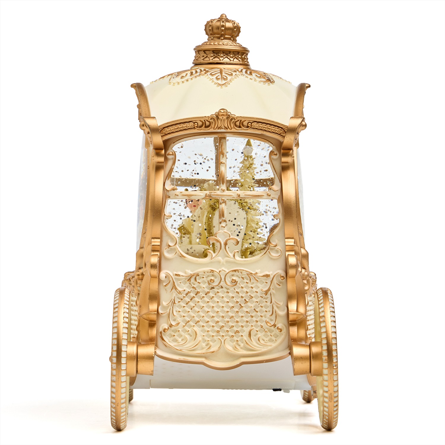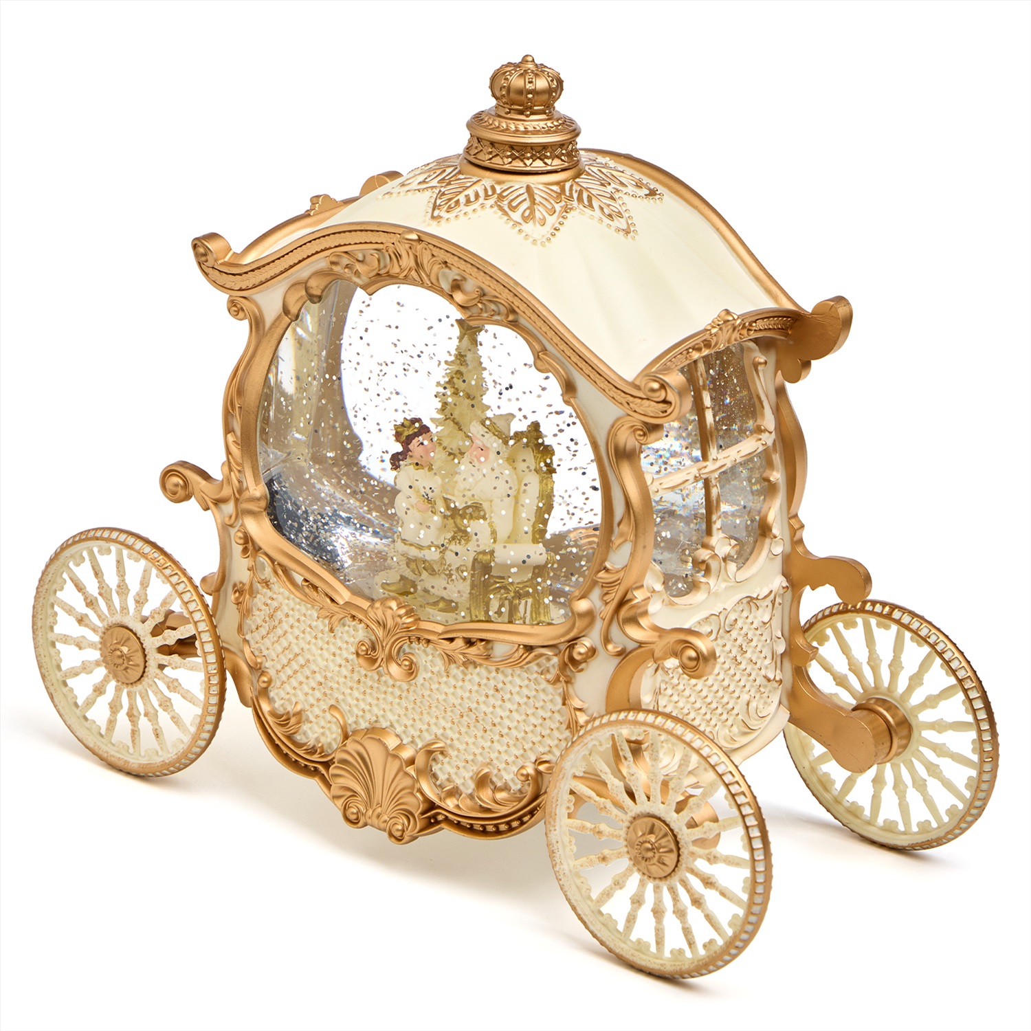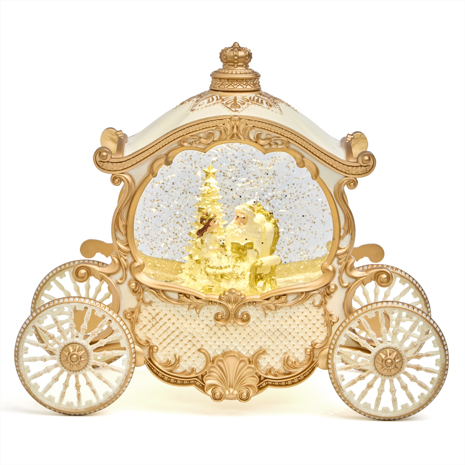 Пусть ваш дом наполнится сказочным волшебством — с этой очаровательной музыкальной каретой из прочного и благородного полистоуна! Она словно вышла прямо из сказки о Золушке: роскошные золотые узоры, изящные колёса, кружевная решётка и прозрачный купол, внутри которого — миниатюрная зимняя сцена с ёлкой и фигурами, окутанная мерцающим сверканием, как будто идёт снежная метель.