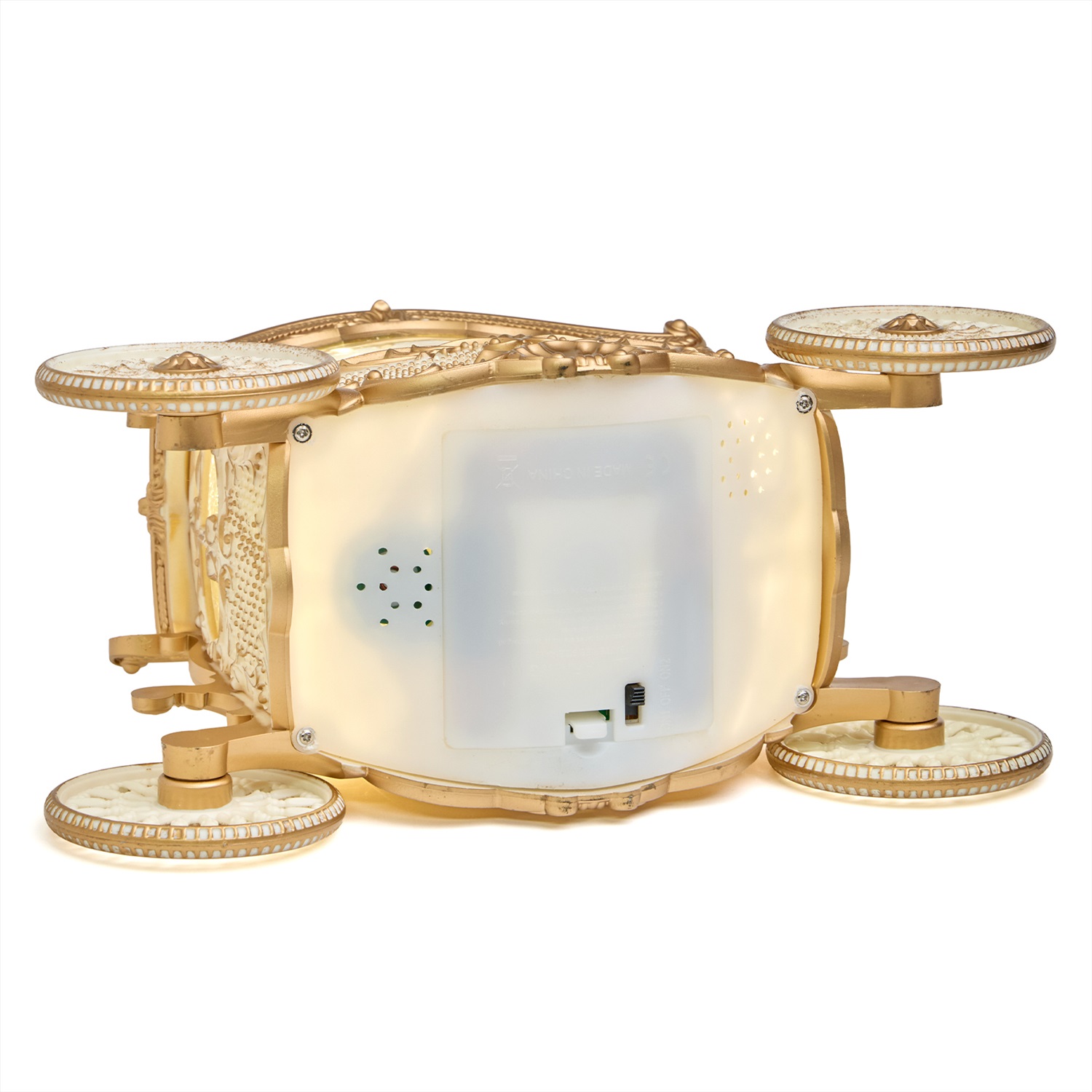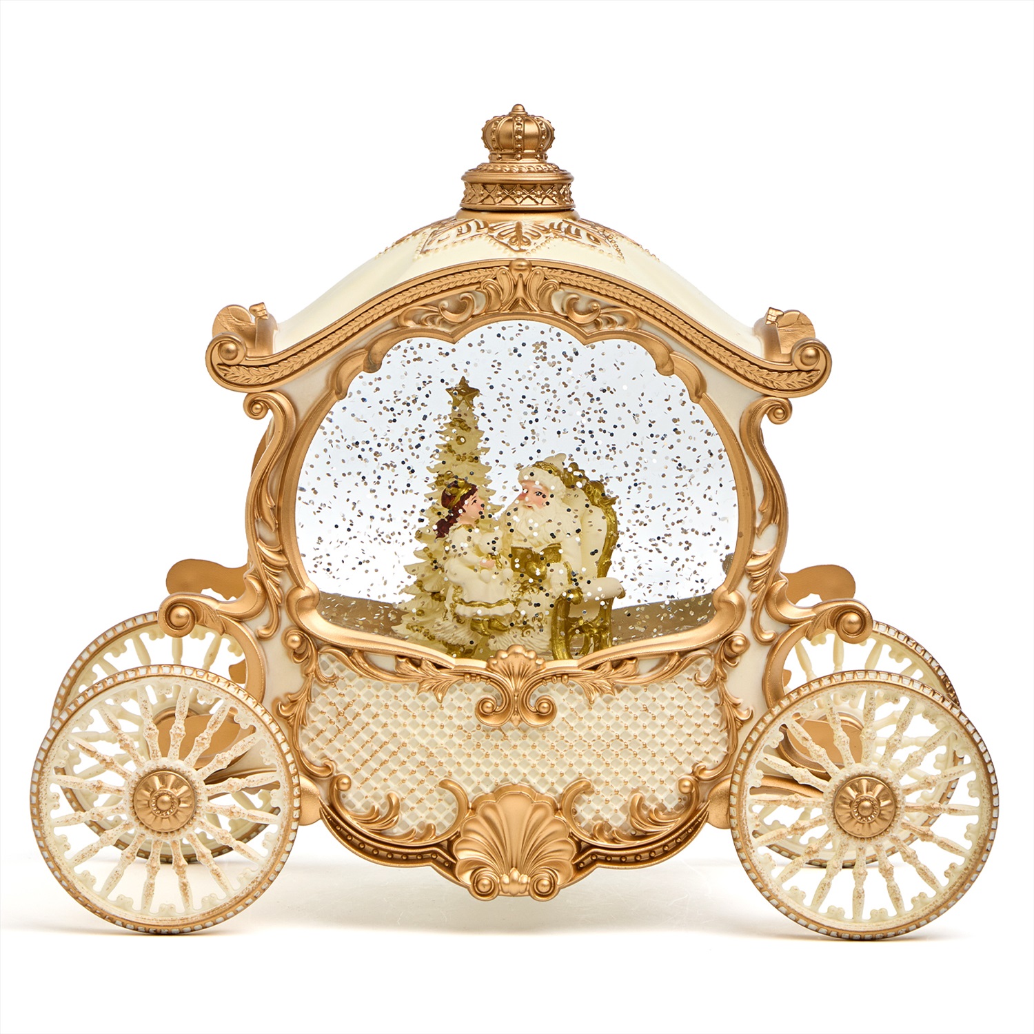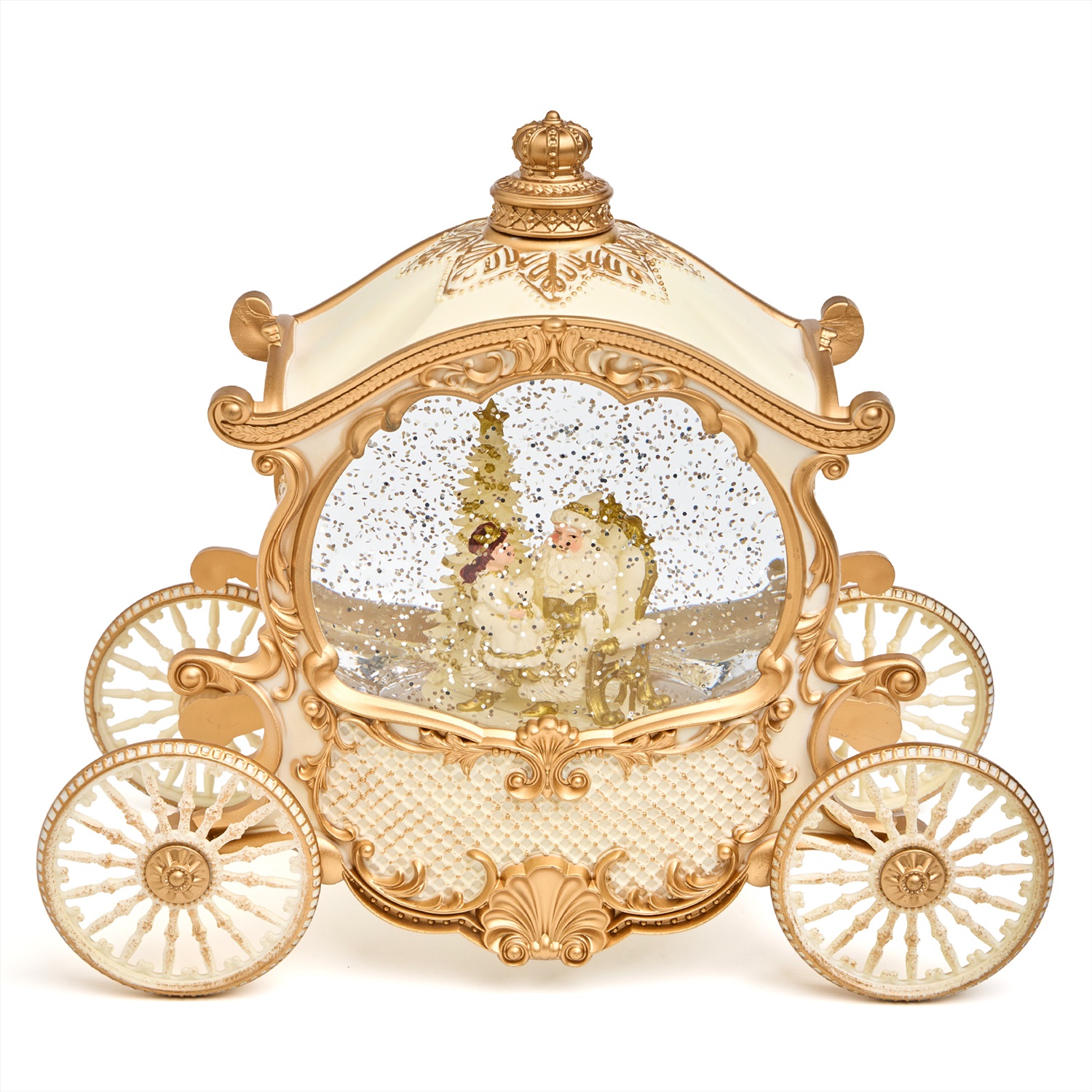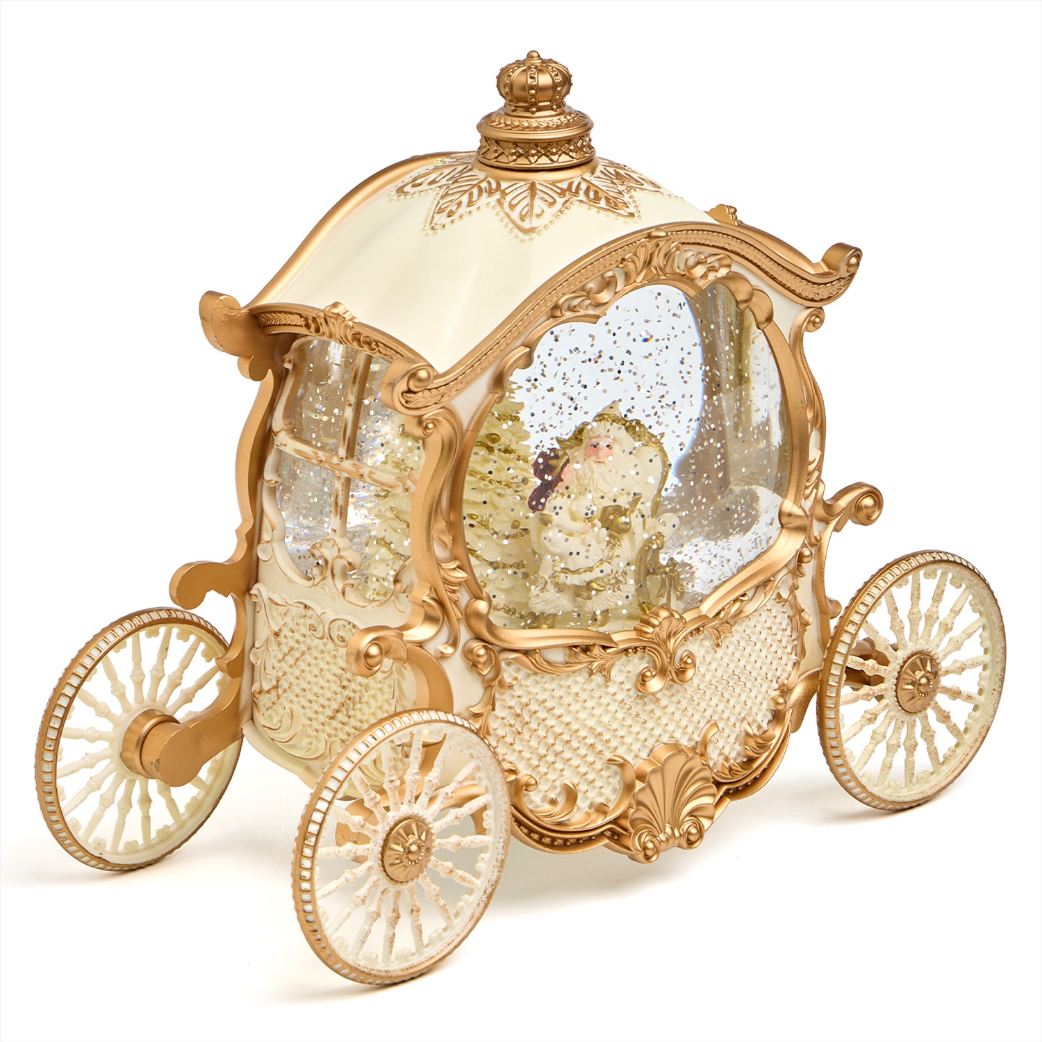 Пусть ваш дом наполнится сказочным волшебством — с этой очаровательной музыкальной каретой из прочного и благородного полистоуна! Она словно вышла прямо из сказки о Золушке: роскошные золотые узоры, изящные колёса, кружевная решётка и прозрачный купол, внутри которого — миниатюрная зимняя сцена с ёлкой и фигурами, окутанная мерцающим сверканием, как будто идёт снежная метель.