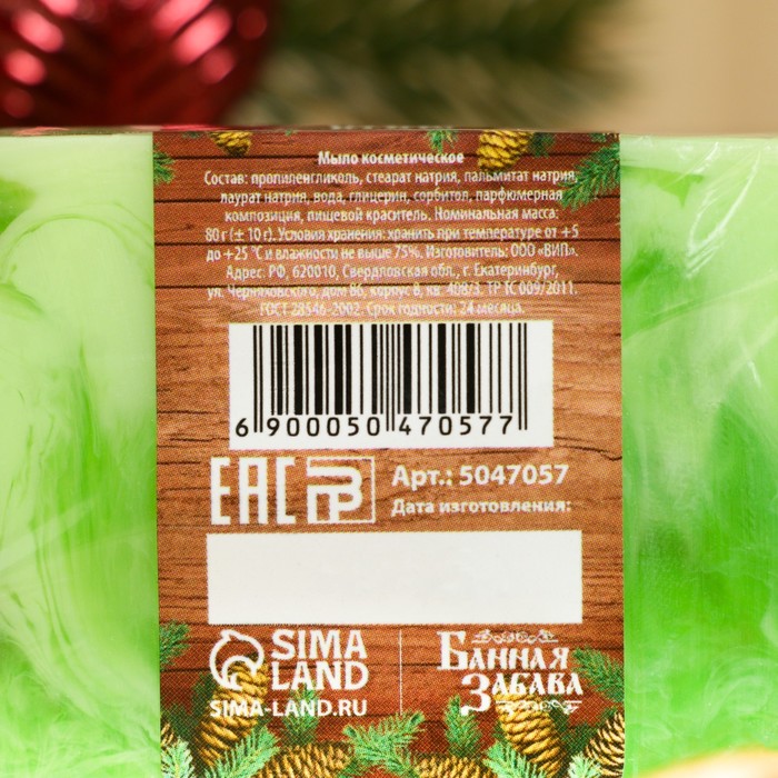 Производитель: Банная забава; Габариты: 8 x 6 x 1,5; Страна: Россия; В боксе: 100 шт; Состав: См. на упаковке; Материалы: см. на упаковке; Фасовка: по 1 шт; Индивидуальная упаковка: Плёнка; Сертификат: ЕАС; Цвет: Зелёный; Вес, г/Объём, мл: 80; Тематика: Новогодняя; Вид упаковки: Термоусадочная плёнка; Тематика праздника: Новый год; Область применения: Для тела, Для рук; Аромат: Мята; Тип: Твёрдое; Вид мыла: Банное, Сувенирное; Темпер. ограничение НЕ НИЖЕ ℃: 0; Фиксированная цена: Да