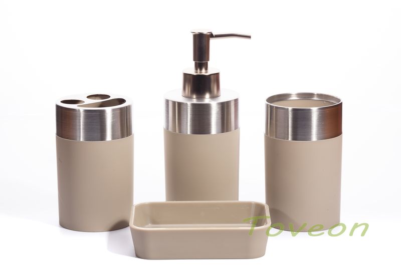 Набор аксессуаров для ванной комнаты (пластик + металл). В набор входит: диспенсер для жидкого мыла (h емкости 17.5 см, диаметр 7 см), стакан для зубных щеток (h 11.2 см, диаметр 7 см), стакан для косметических аксессуаров (h 11.2 см, диаметр 7 см), мыльница (12 х 9 х 3 см). Вес 0.5 кг