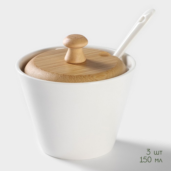 Производитель: BellaTenero; Габариты: 25 x 12 x 14,5; Страна: Китай; В боксе: 12 набор; В наборе: 3 набор; Состав: Бамбук, фарфор; Материалы: бамбук, фарфор; Фасовка: по 1 набор; Индивидуальная упаковка: Картонная коробка; Габариты товара: 14 см × 9,5 см × 28 см; Сертификат: СТР; Набор: Да; Цвет: Белый; Объём, л: 0,15; В наборе, шт.: 7; Объём, мл: 150; Тематика: Однотонная; Вид упаковки: Коробка картонная; Рисунок: Нет; Крышка: Да; Материал крышки: Бамбук; Тематика праздника: Универсальная тематика; Материал: Фарфор; Герметичная крышка: Нет; Наличие подставки: Да; Для детей до 3 лет: Нет; Можно мыть в посудомоечной машине: Да; Можно использовать в СВЧ-печи: Нет; Текстура: Гладкая; Назначение: Для сыпучих; Матовая поверхность: Нет; Особенности: С ложкой, На подставке; Фиксированная цена: Да