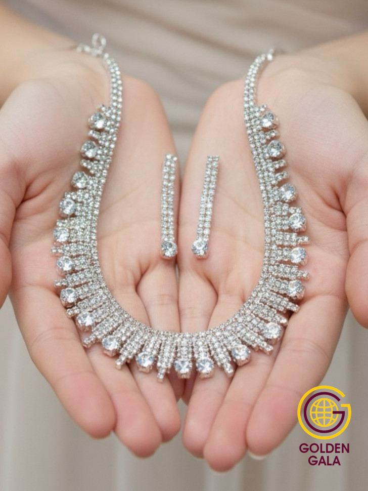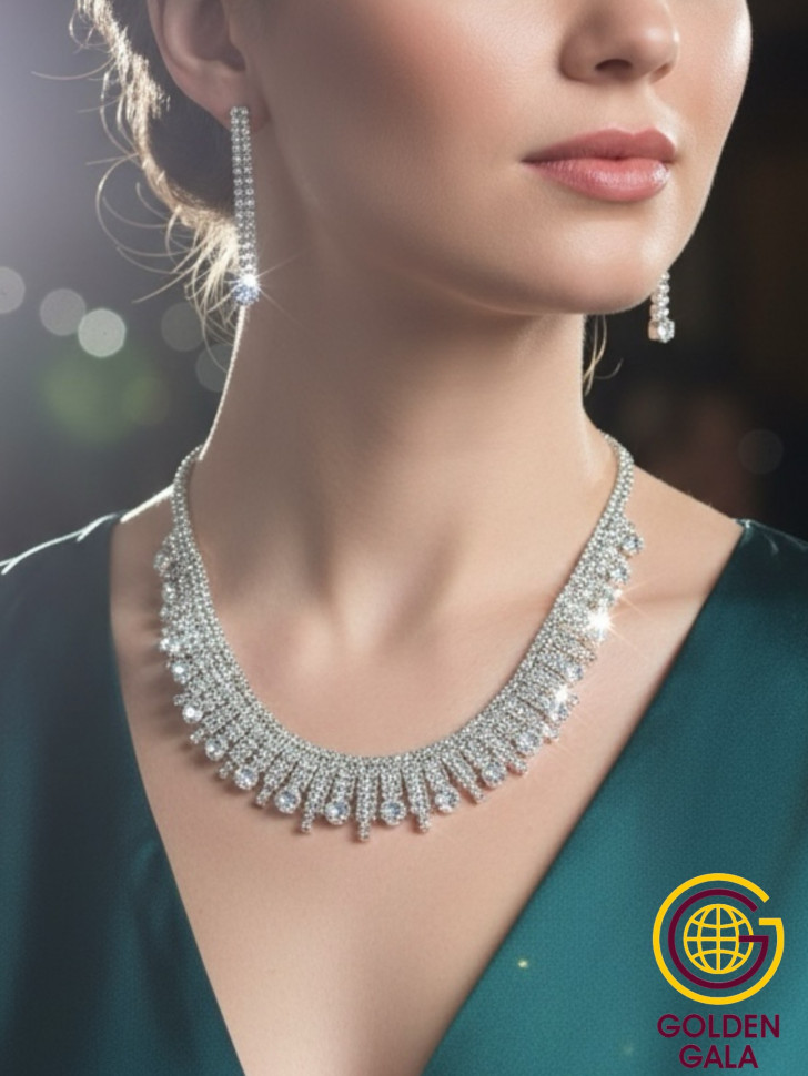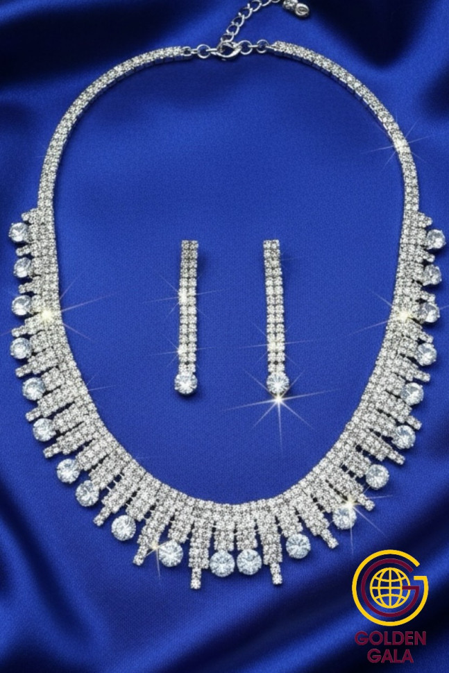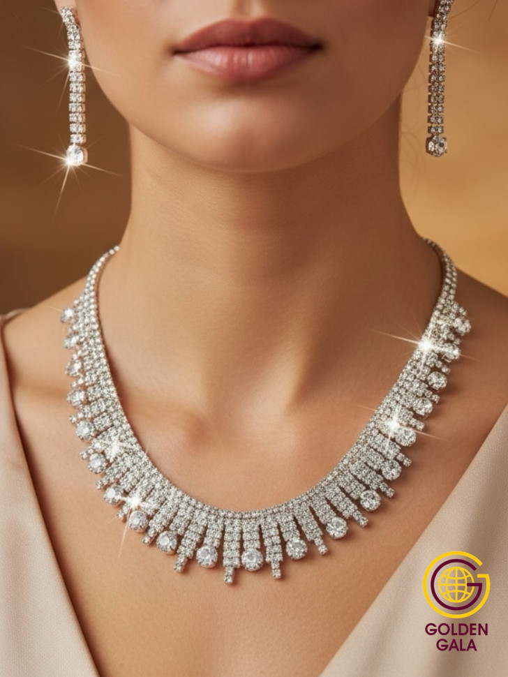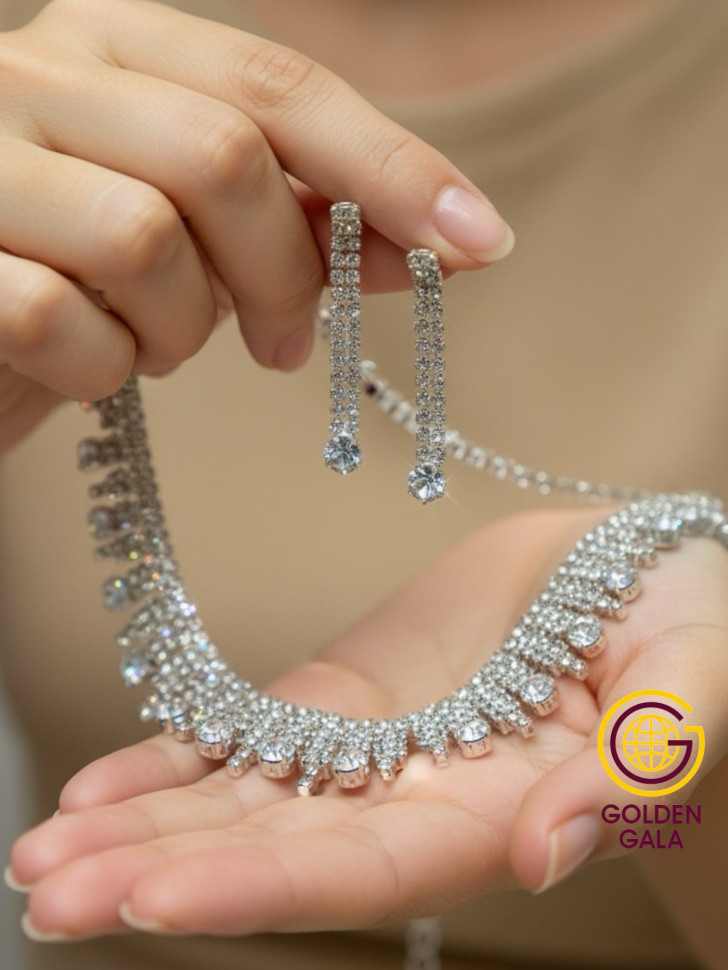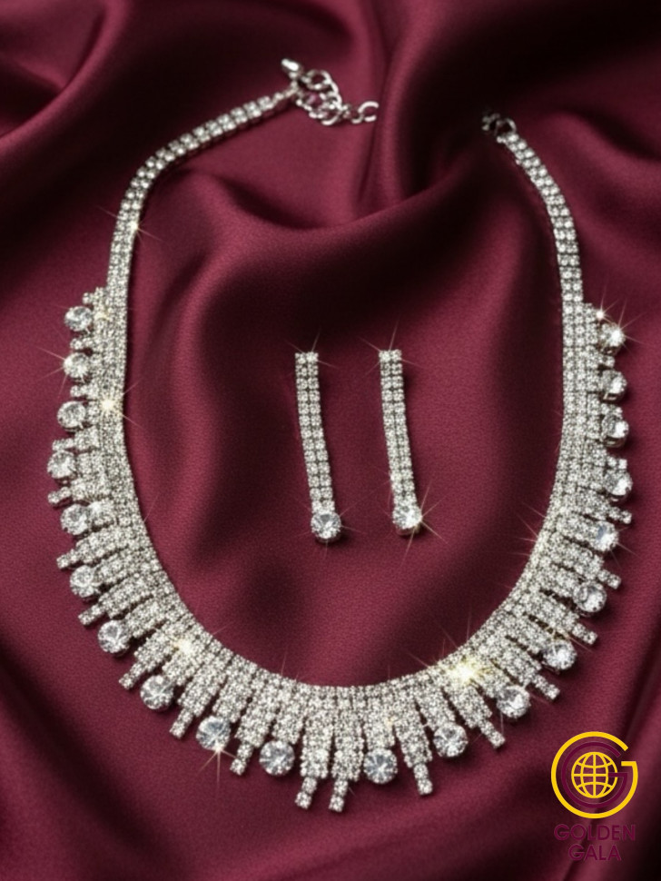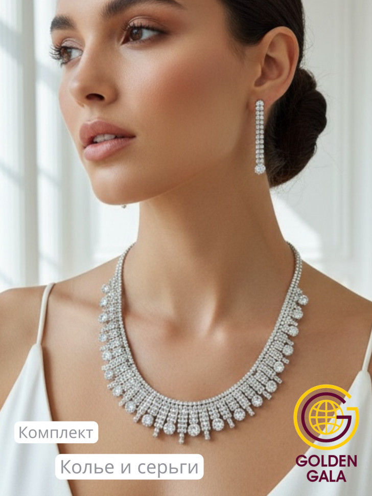 Колье на шею и серьги комплект "Вечерний шарм", качественная женская бижутерия выполнена из гипоаллергенного сплава. Набор колье и серьги имеет оригинальный дизайн, с использованием камней и страз из циркона, которые блестят при любом освещении. Элегантный комплект ожерелье на шею и серьги станет отличным дополнением Вашего образа на свадьбу, выпускной, выступление и любое мероприятие. Колье на шею можно регулировать при помощи цепочки до 50 см, оно может быть длинное или короткое по Вашему вкусу. Серьги с удобным креплением гвоздики имеют длину 4 см. Продуманный и оригинальный образ всегда притягивает взгляды и вызывает восхищение окружающих!