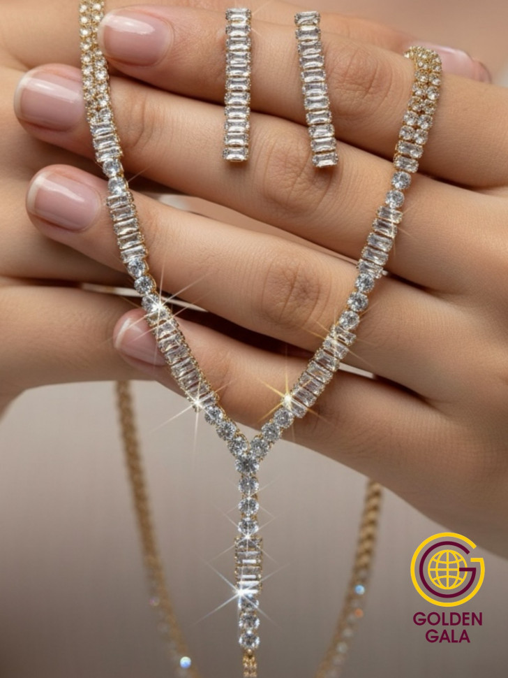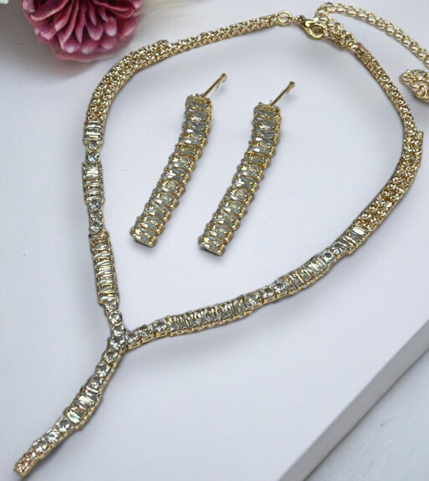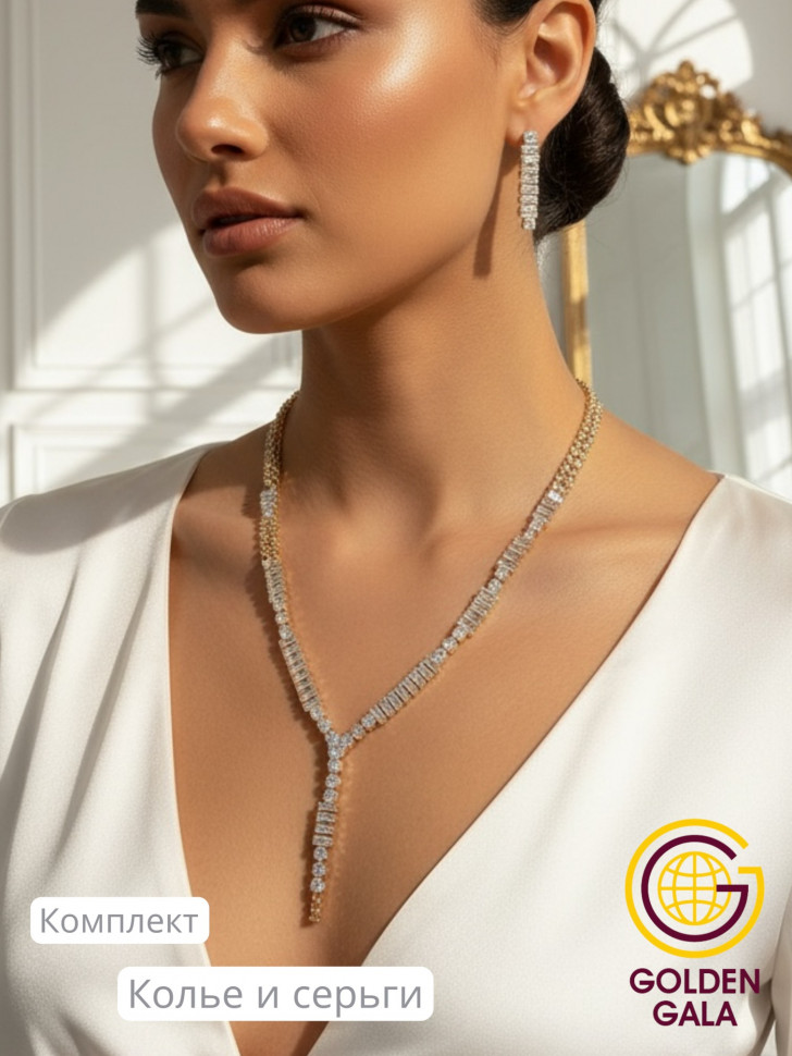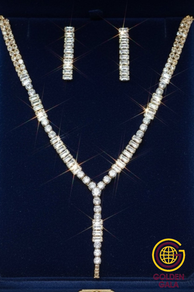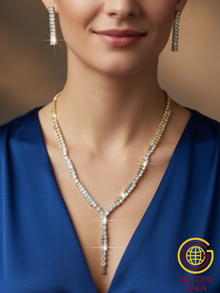Набор колье и серьги имеет оригинальный дизайн, с использованием камней и страз из циркона, которые блестят при любом освещении. Элегантный комплект ожерелье на шею и серьги станет отличным дополнением Вашего образа на свадьбу, выпускной, выступление и любое мероприятие.