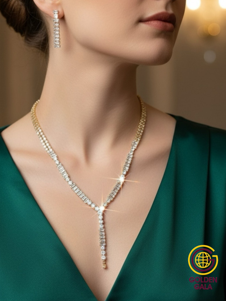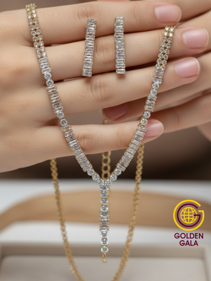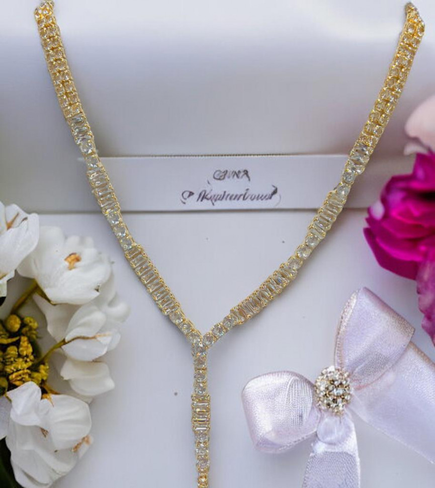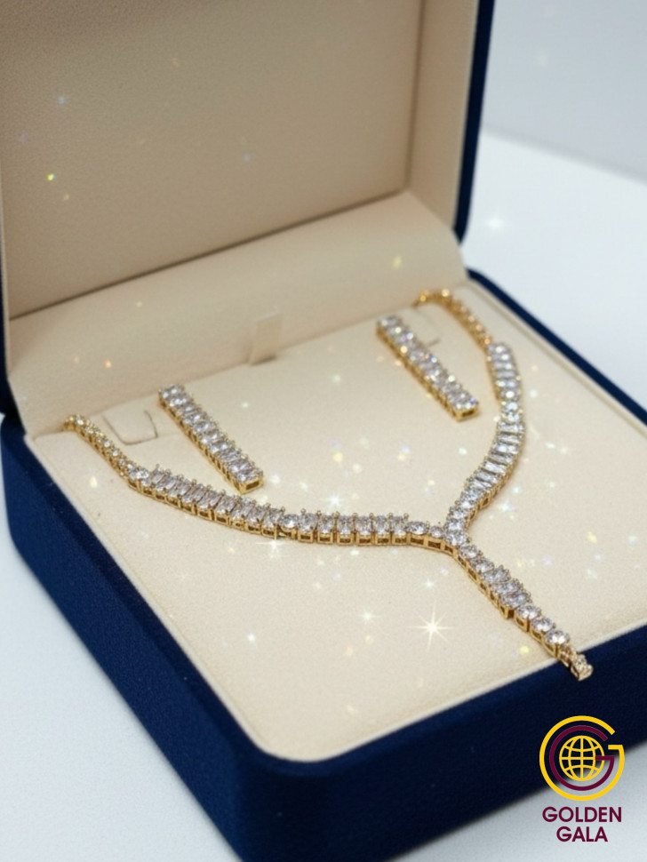Набор колье и серьги имеет оригинальный дизайн, с использованием камней и страз из циркона, которые блестят при любом освещении. Элегантный комплект ожерелье на шею и серьги станет отличным дополнением Вашего образа на свадьбу, выпускной, выступление и любое мероприятие.