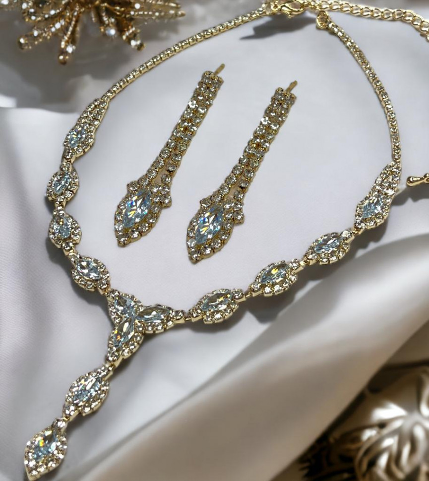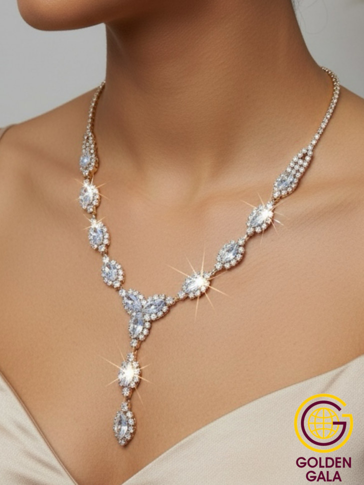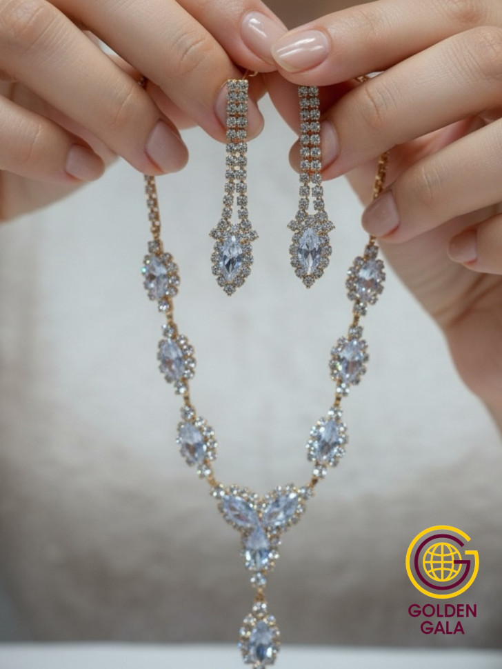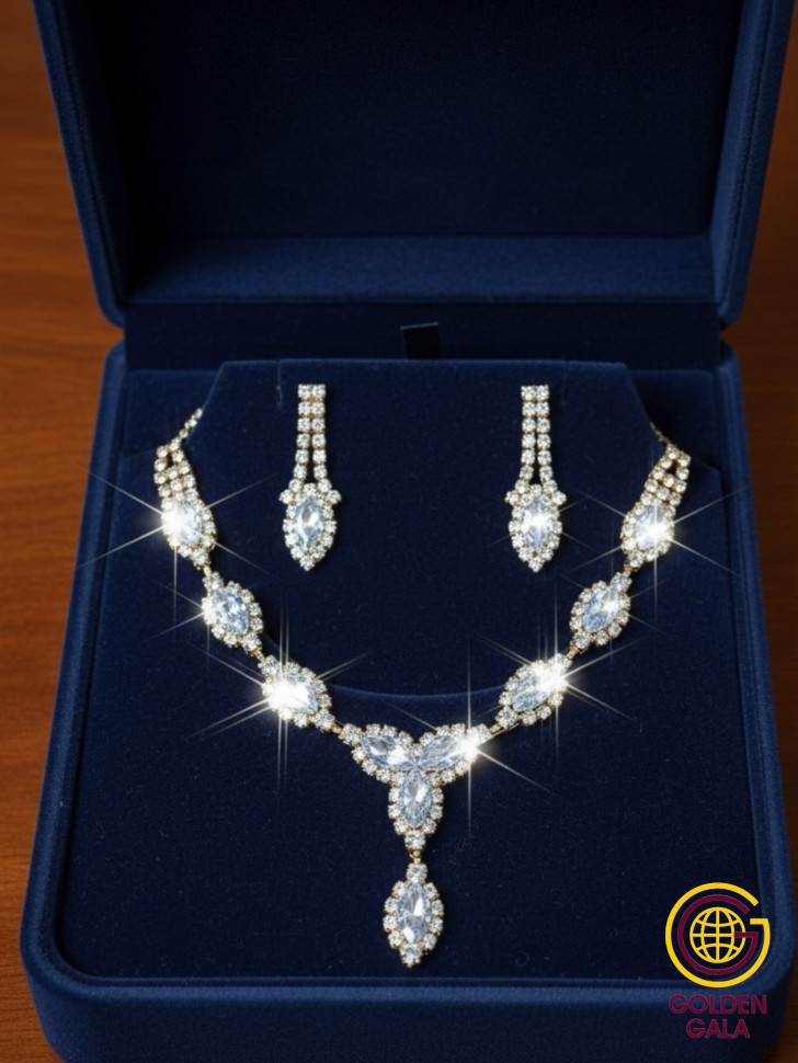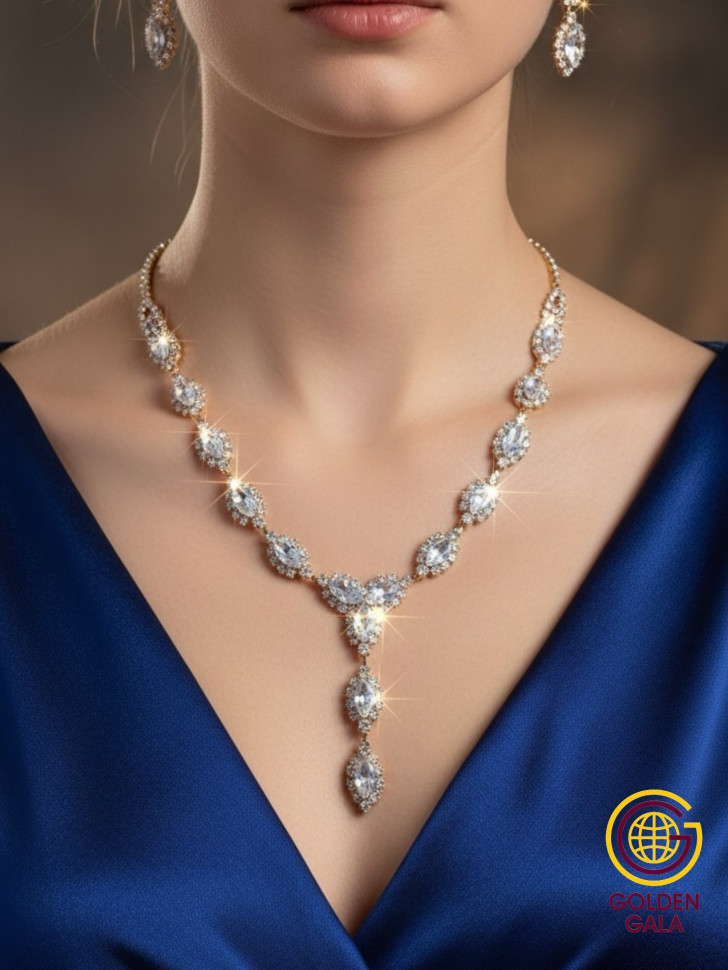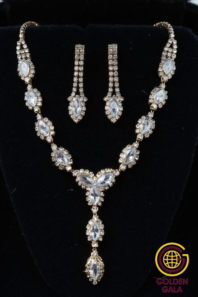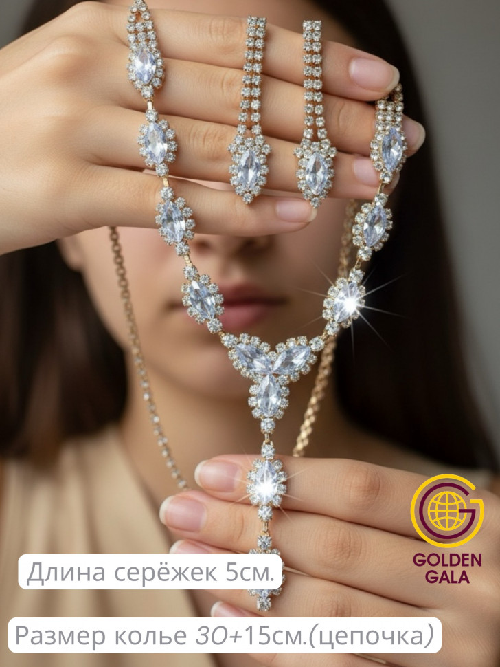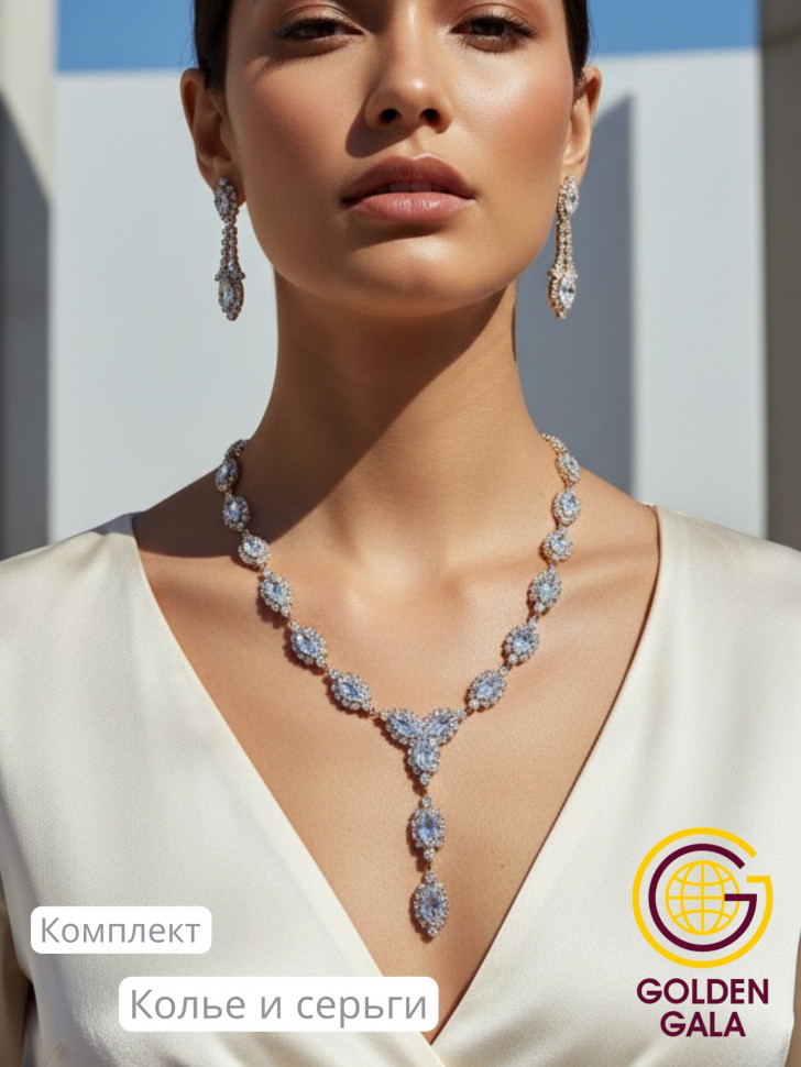 Набор колье и серьги имеет оригинальный дизайн, с использованием камней и страз из циркона, которые блестят при любом освещении. Элегантный комплект ожерелье на шею и серьги станет отличным дополнением Вашего образа на свадьбу, выпускной, выступление и любое мероприятие.