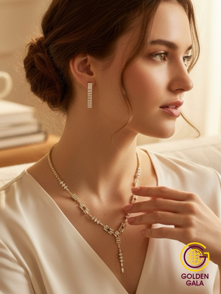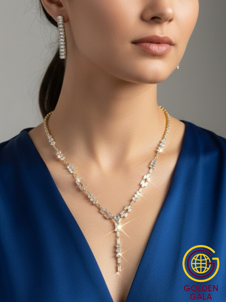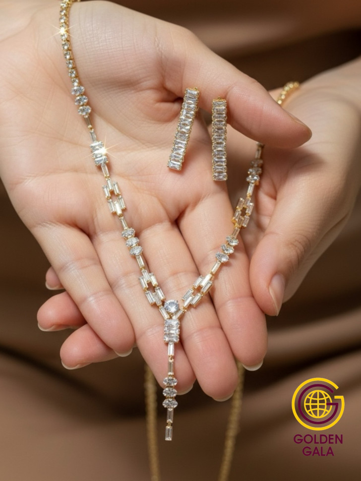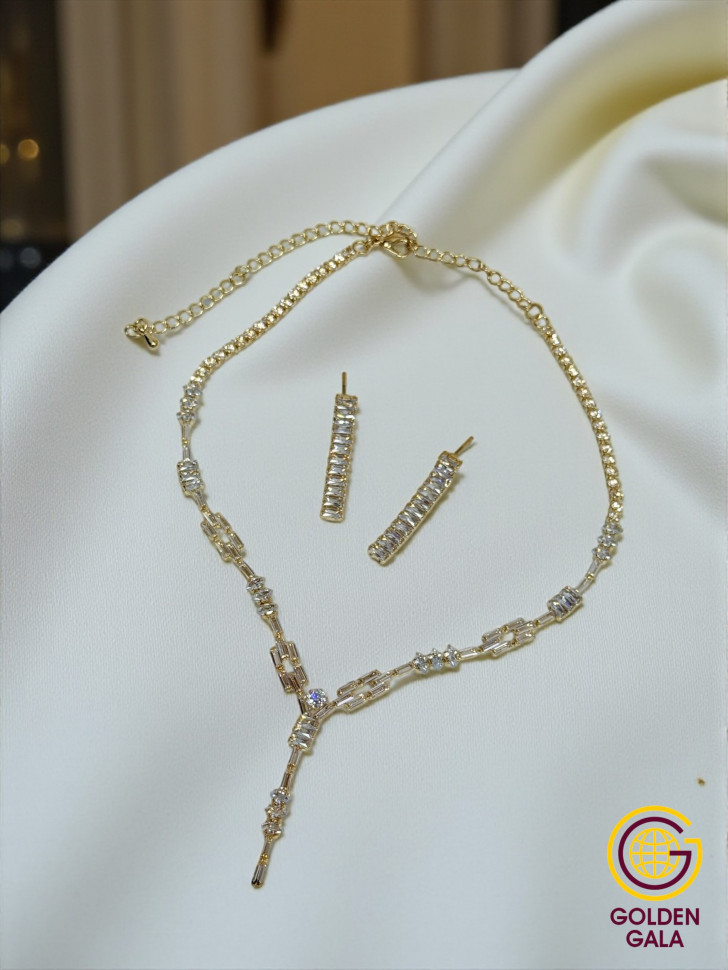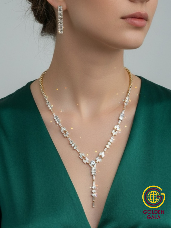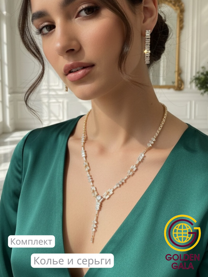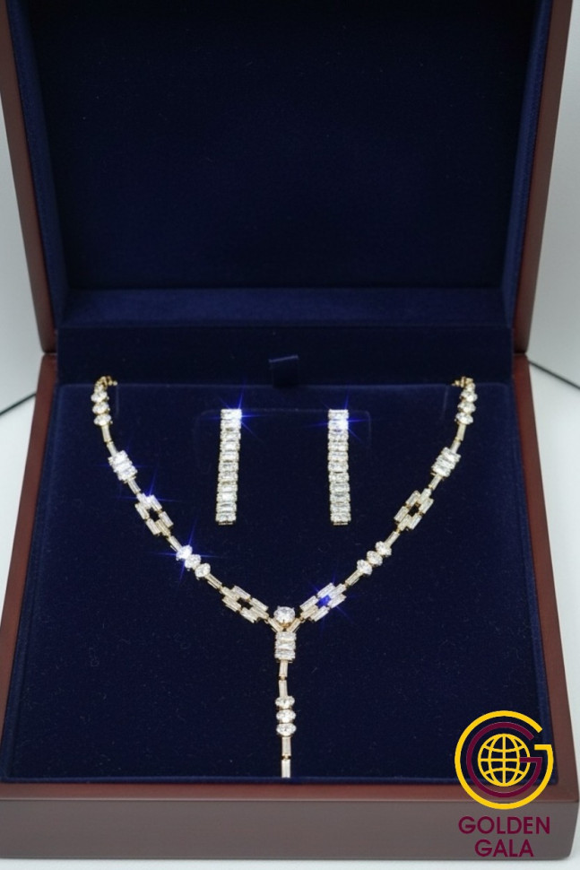 Набор колье и серьги имеет оригинальный дизайн, с использованием камней и страз из циркона, которые блестят при любом освещении. Элегантный комплект ожерелье на шею и серьги станет отличным дополнением Вашего образа на свадьбу, выпускной, выступление и любое мероприятие.