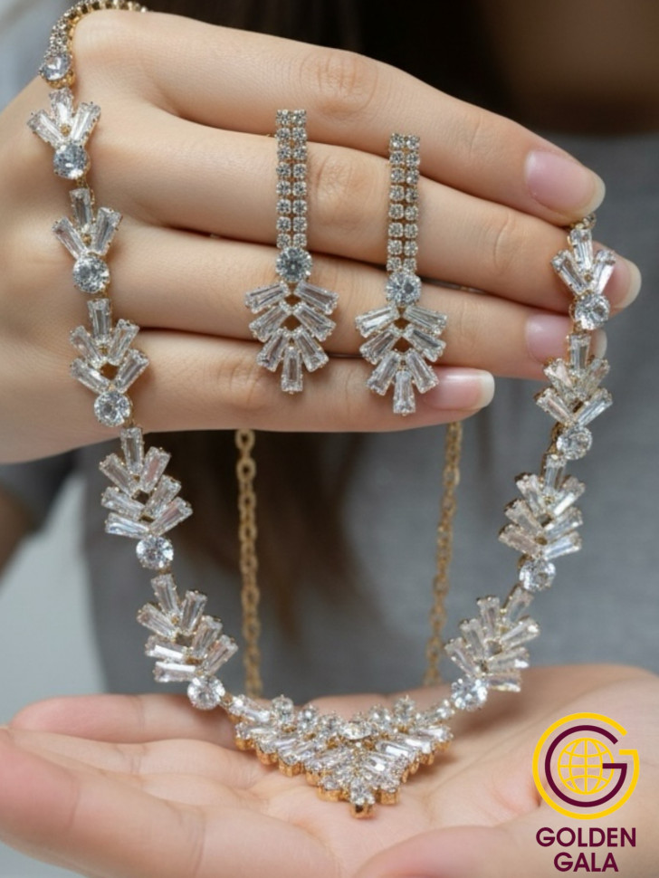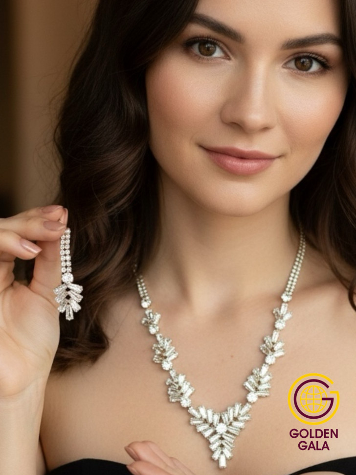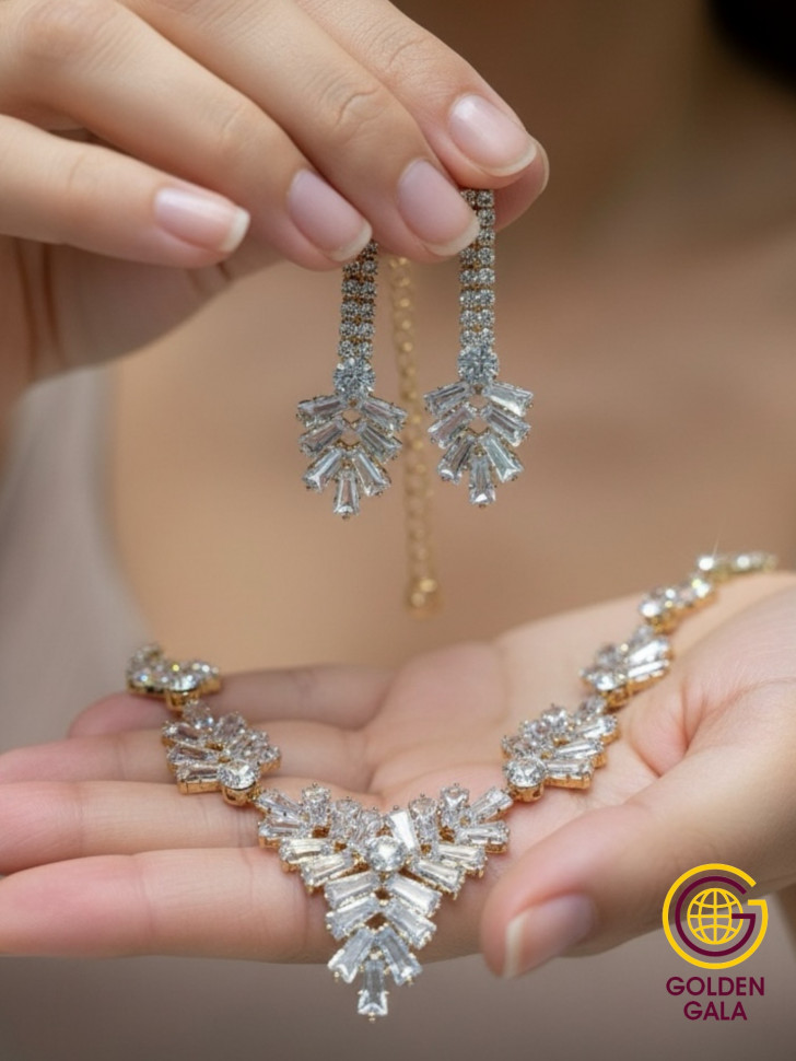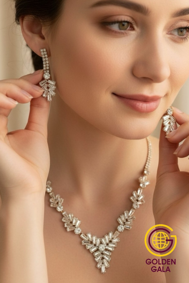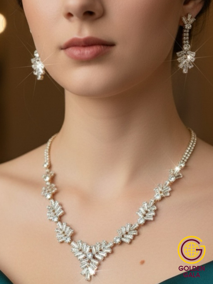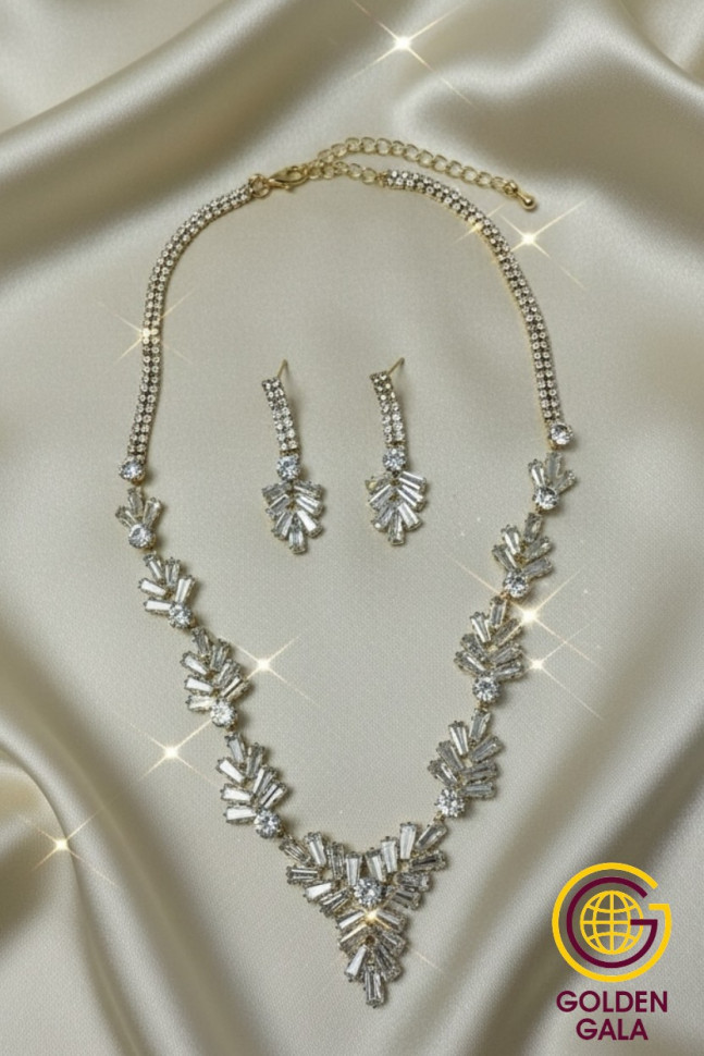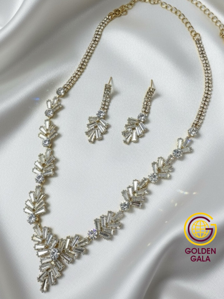 Набор колье и серьги имеет оригинальный дизайн, с использованием камней и страз из циркона, которые блестят при любом освещении. Элегантный комплект ожерелье на шею и серьги станет отличным дополнением Вашего образа на свадьбу, выпускной, выступление и любое мероприятие.