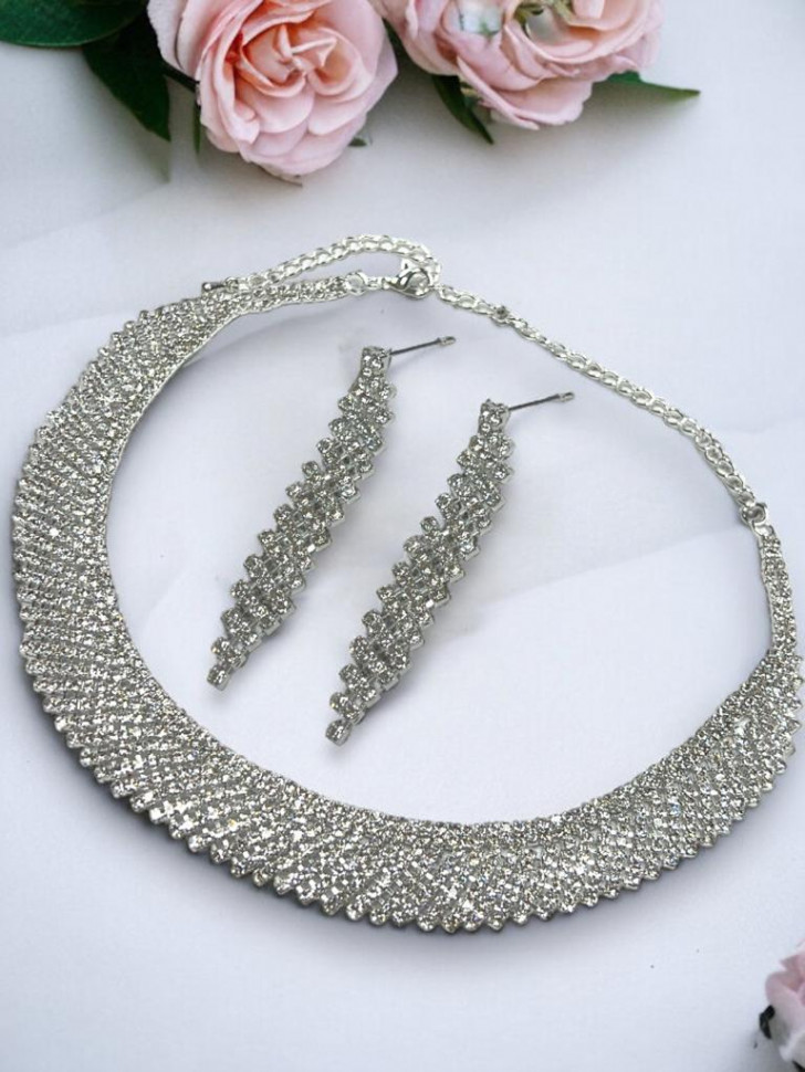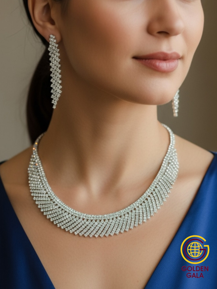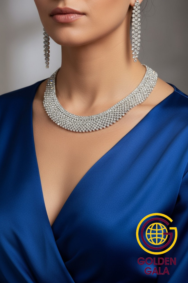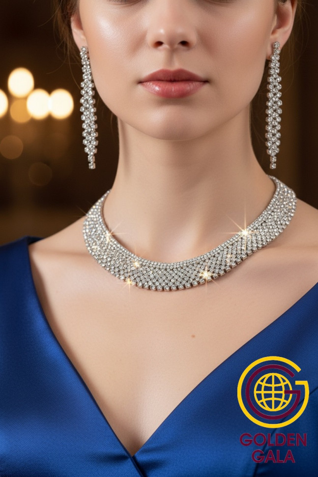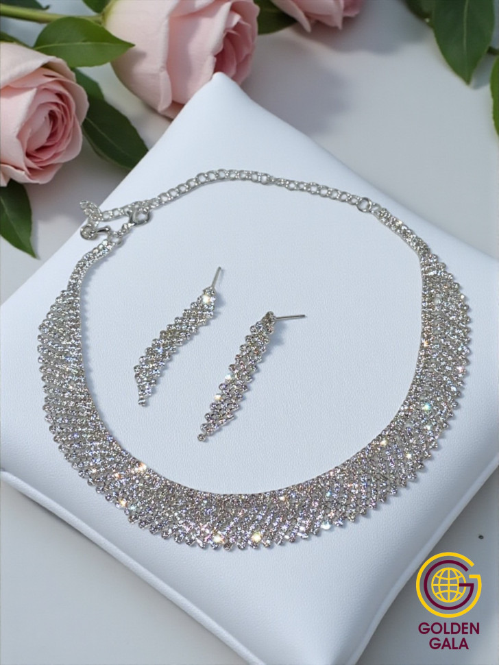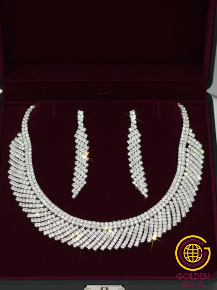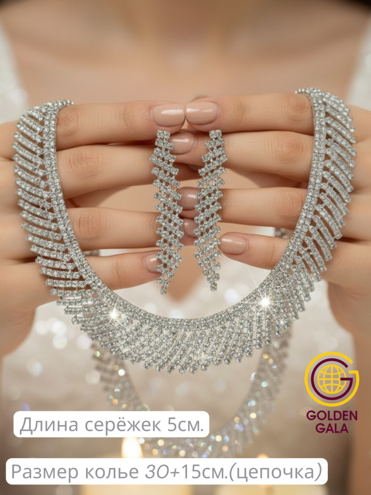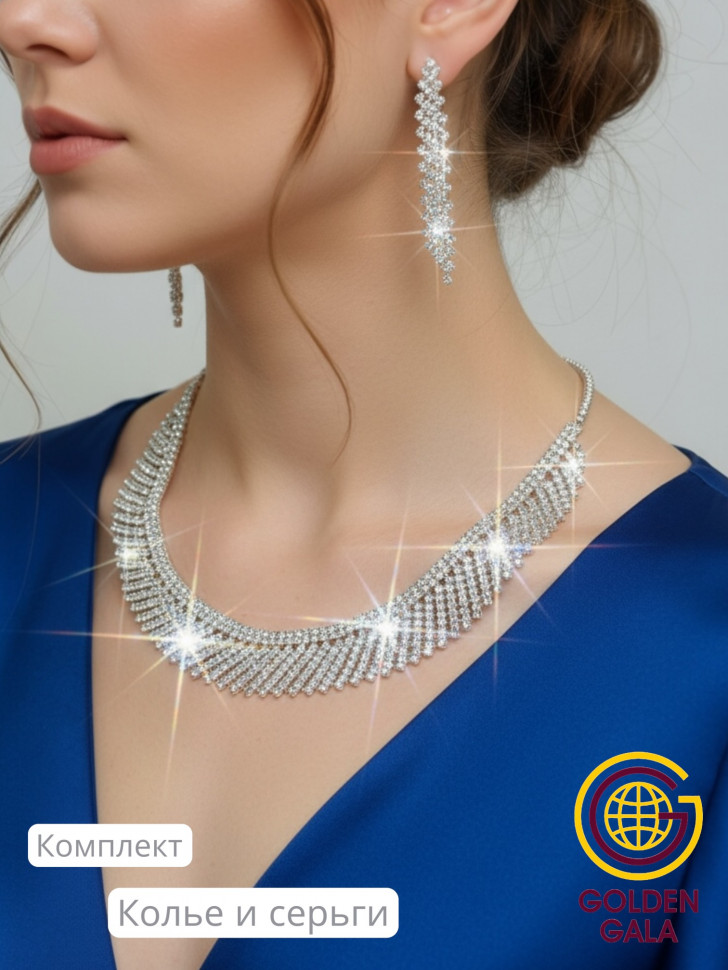 Набор колье и серьги имеет оригинальный дизайн, с использованием камней и страз из циркона, которые блестят при любом освещении. Элегантный комплект ожерелье на шею и серьги станет отличным дополнением Вашего образа на свадьбу, выпускной, выступление и любое мероприятие.