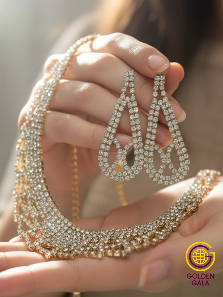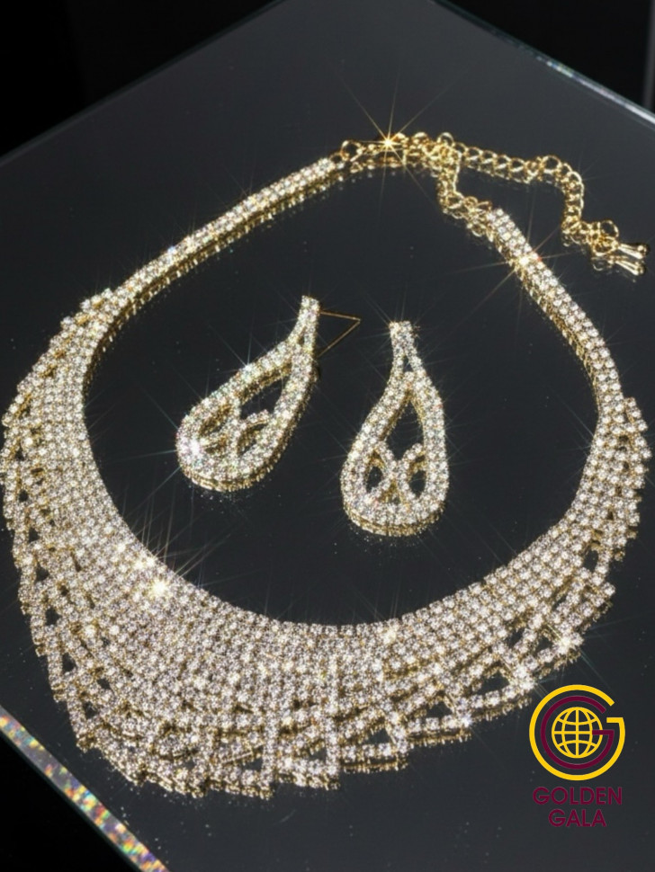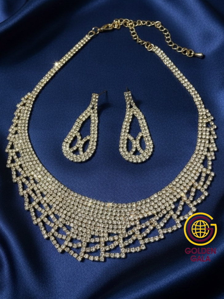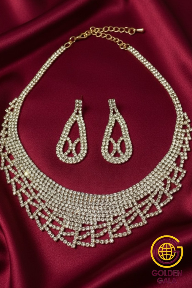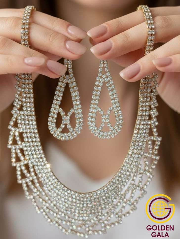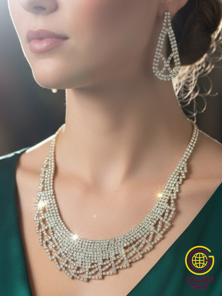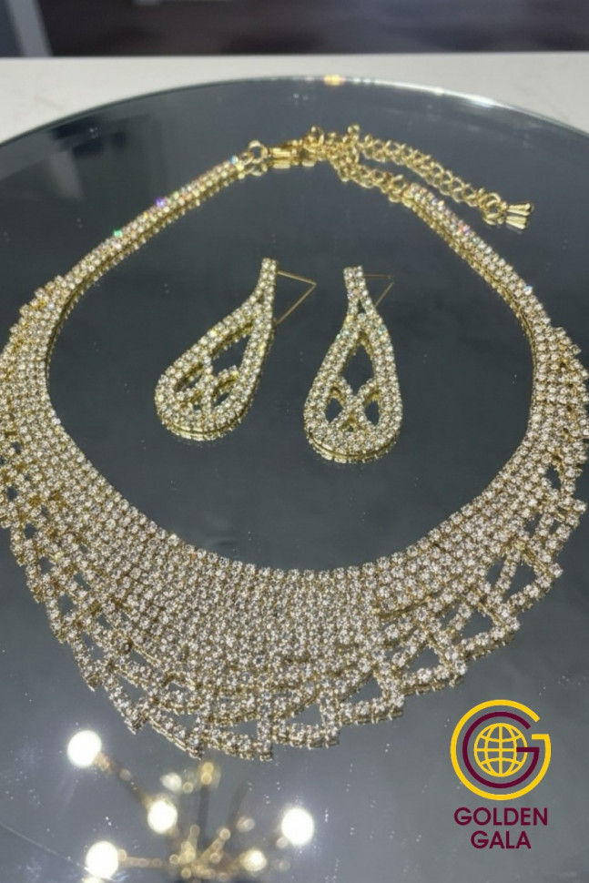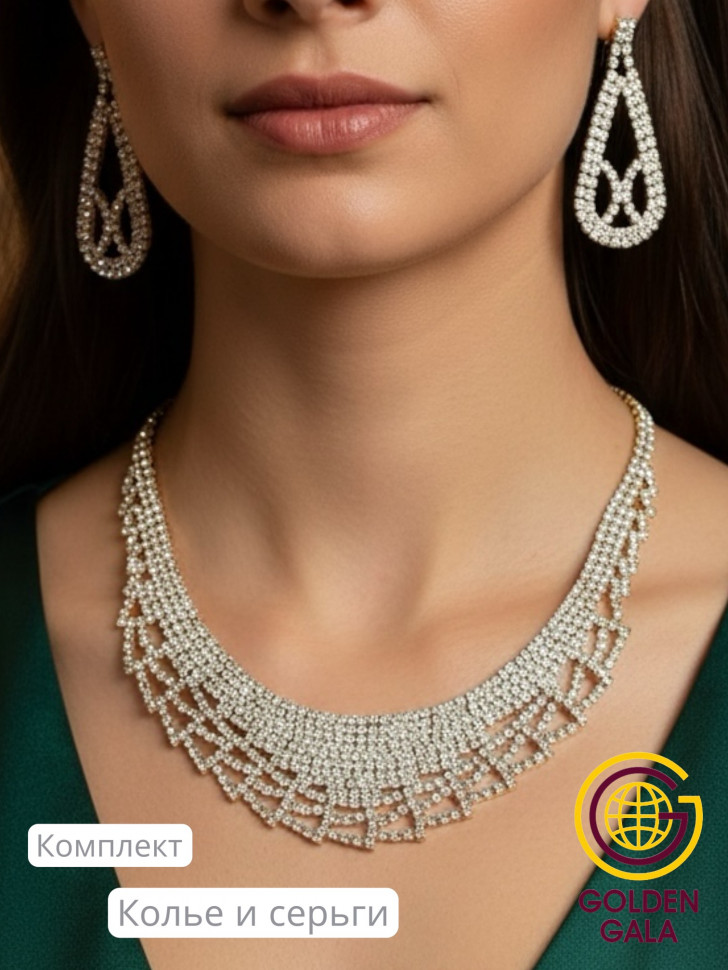 Набор колье и серьги имеет оригинальный дизайн, с использованием камней и страз из циркона, которые блестят при любом освещении. Элегантный комплект ожерелье на шею и серьги станет отличным дополнением Вашего образа на свадьбу, выпускной, выступление и любое мероприятие.