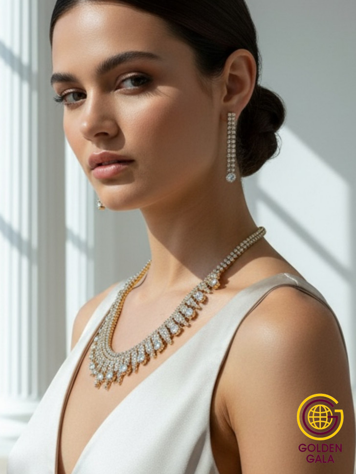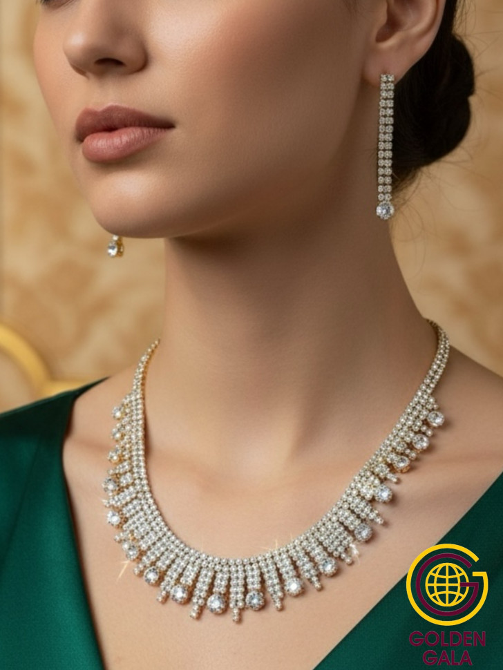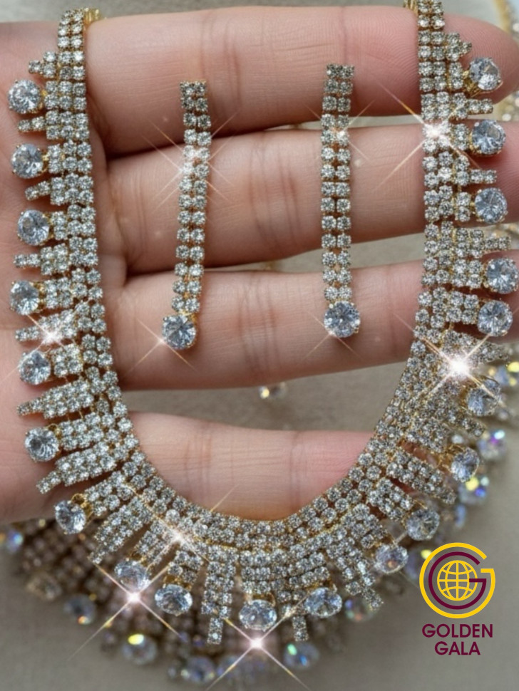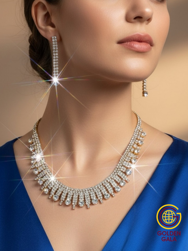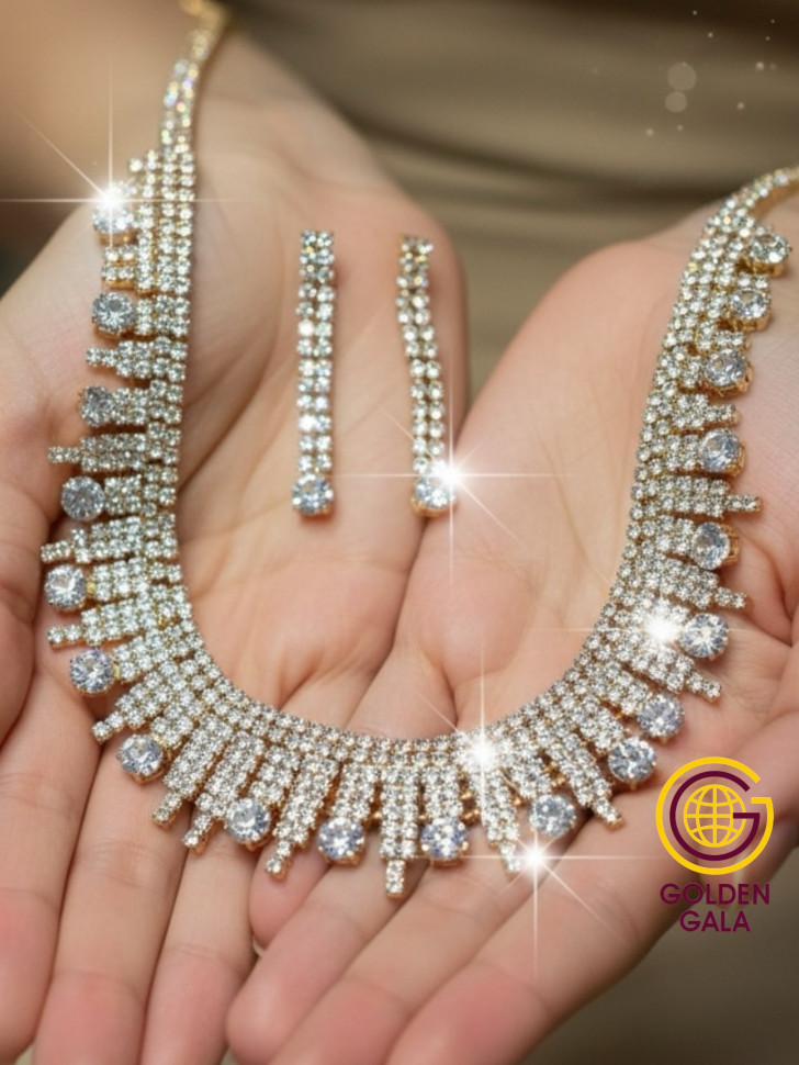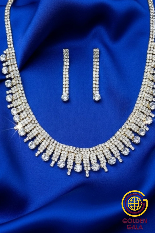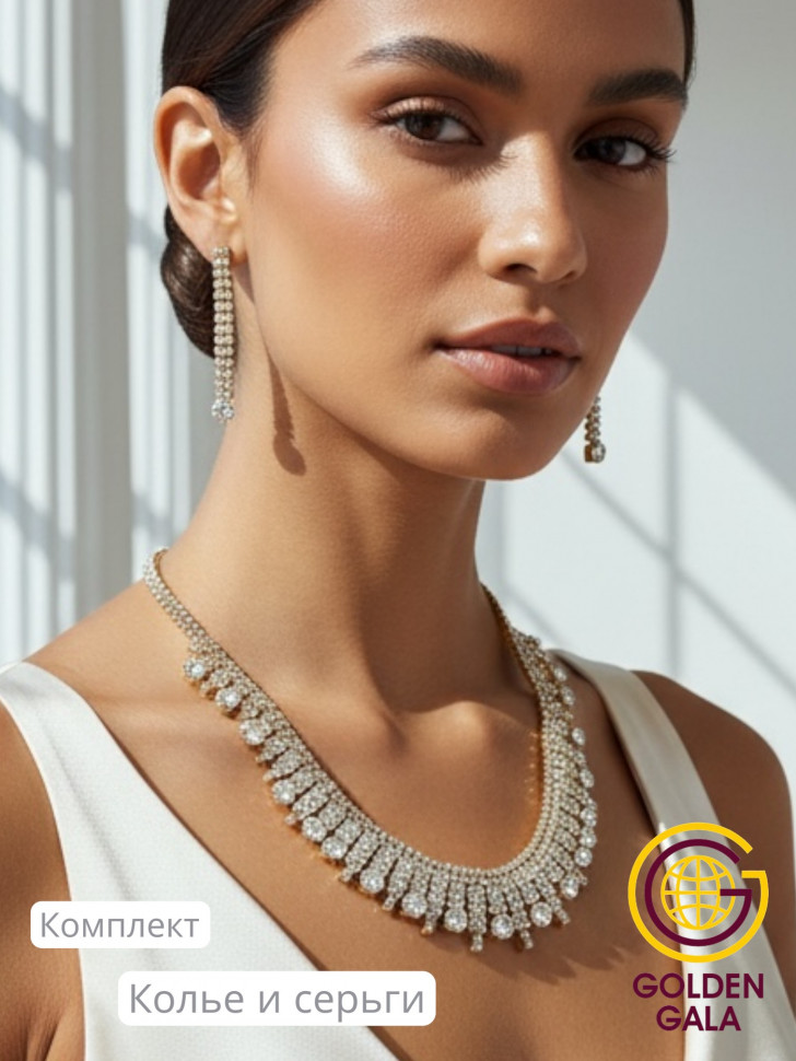 Набор колье и серьги имеет оригинальный дизайн, с использованием камней и страз из циркона, которые блестят при любом освещении. Элегантный комплект ожерелье на шею и серьги станет отличным дополнением Вашего образа на свадьбу, выпускной, выступление и любое мероприятие.