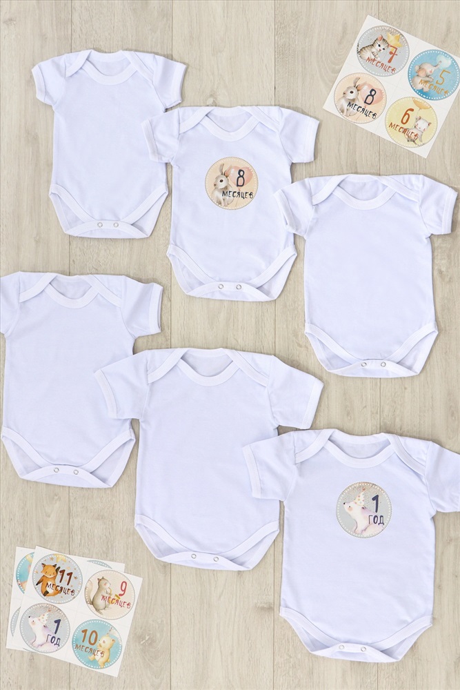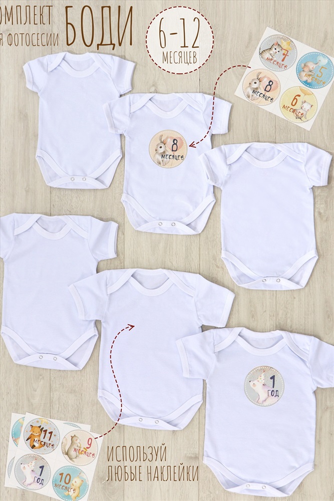 Набор из 6 боди от 6 до 12 месяцев для фотосессии. Приобрести карточки или наклейки для фотосессии вы можете на маркетплейсе там они представленны в большом ассортименте на любой вкус по низким ценам, делайте коллаж из фото. В течении полугода с первых дней жизни вы сможете запечатлить любой момент роста своего малыша и любоваться потом и вспоминать всю жизнь эти приятные моменты. Или просто использовать боди как предмет одежды по мере роста вашего ребенка. Трикотажная ткань гипоалергенна. Материал высокого качества сохраняет форму и легко стирается. Хлопок обеспечивает отличную терморегуляцию и воздухообмен, чтобы малыш не потел. В такой одежде Ваш ребёнок всегда будет чувствовать себя комфортно и уютно. 50 размер швы наружу