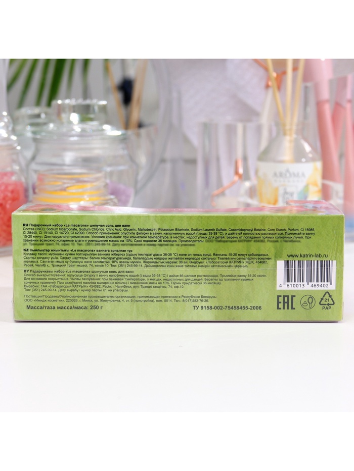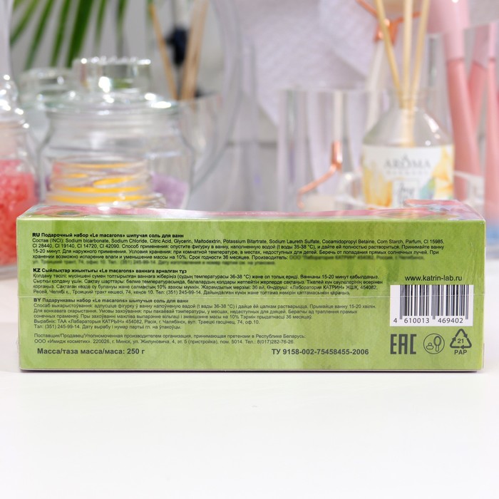 Производитель: Laboratory Katrin; Габариты: 15,5 x 5 x 5; Доставка: Платная; Страна: Россия; В боксе: 8 шт; Состав: См. на упаковке; Материалы: см. на упаковке; Фасовка: по 1 шт; Индивидуальная упаковка: Плёнка; Сертификат: ЕАС; Набор: Да; Для кого: Унисекс; Форма: Фигурная; В наборе, шт.: 5; Вес, г: 250; Вид упаковки: PVC-коробка; Тематика праздника: Универсальная тематика; Адресат: Жене/Невесте; Возраст: Любой; Аромат: Корица, Ваниль, Миндаль, Ягоды, Тирамису, Цитрусовый микс; Составляющие набора: Бомбочка для ванн; Темпер. ограничение НЕ НИЖЕ ℃: 0; Возраст: Для взрослых; Особенности: Без особенностей Нежные и воздушные макаруны – это невероятное лакомство! Они отлично увлажняют и питают кожу, снимают напряжение и дарят ей обновление. Набор Le macarons – это отличный подарок для любителей сладкого без лишних калорий и любителей всегда быть неотразимыми. Ванна с шипучей солью смягчает и очищает кожу, оказывает комплексное воздействие на организм не только через кожный покров, но и посредством ароматерапии. Рекомендовано для ежедневного использования. Не окрашивает ванну и кожу. Состав: бикарбонат натрия, соль морская, кислота лимонная, парфюмерная композиция, глицерин, CI 28085, CI 19140, CI 15985, CI 42090, CI 45100, CI 14720, CI 14720, CI 28440.