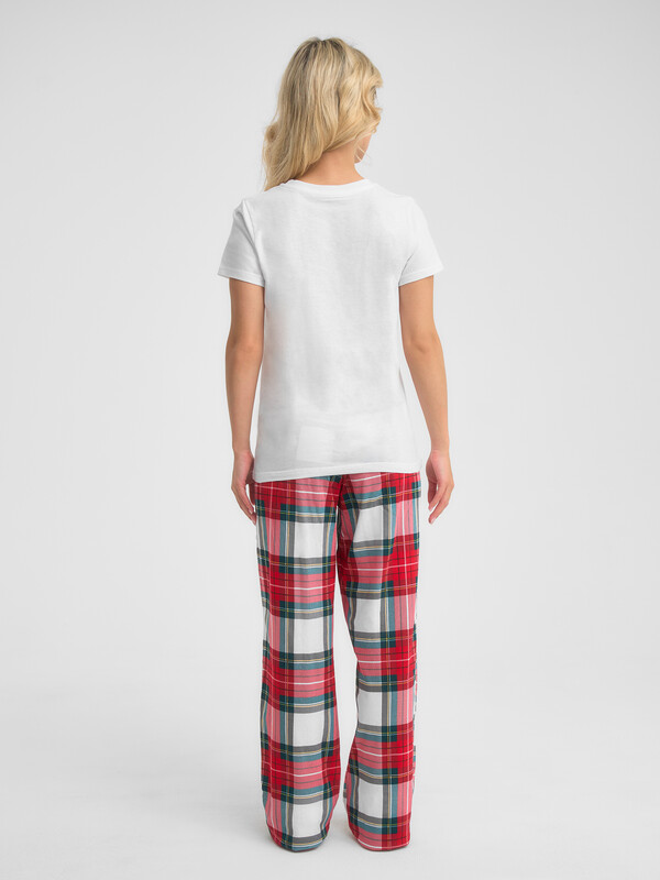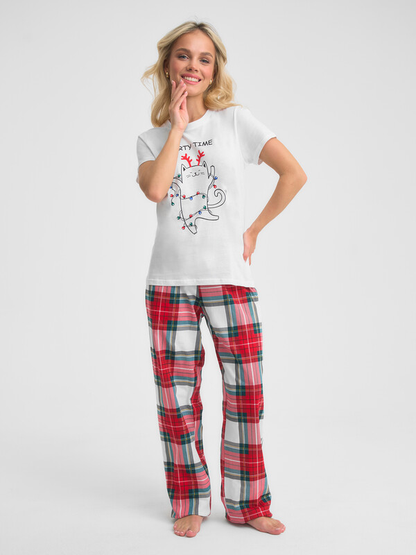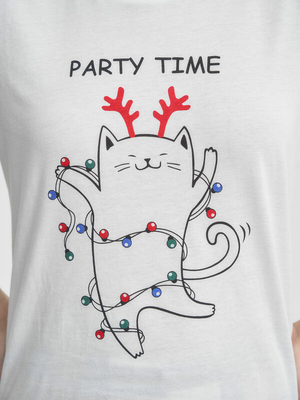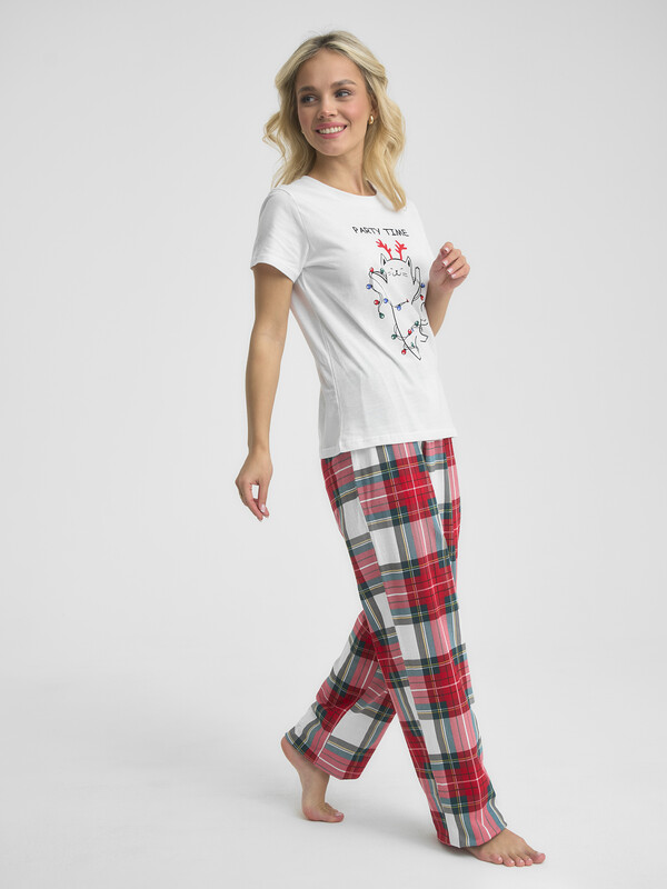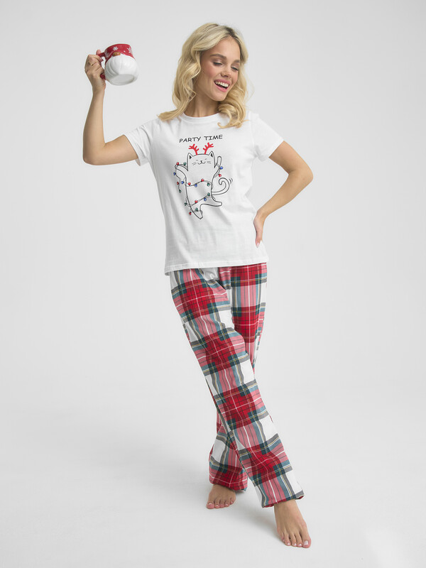 Производитель: Sensera Трикотажная пижама с Новогодней тематикой. Белая футболка свободного кроя длиной до бердра украшена принтом веселого котика с гирляндой. Принтованные брюки свободного кроя на резинке.