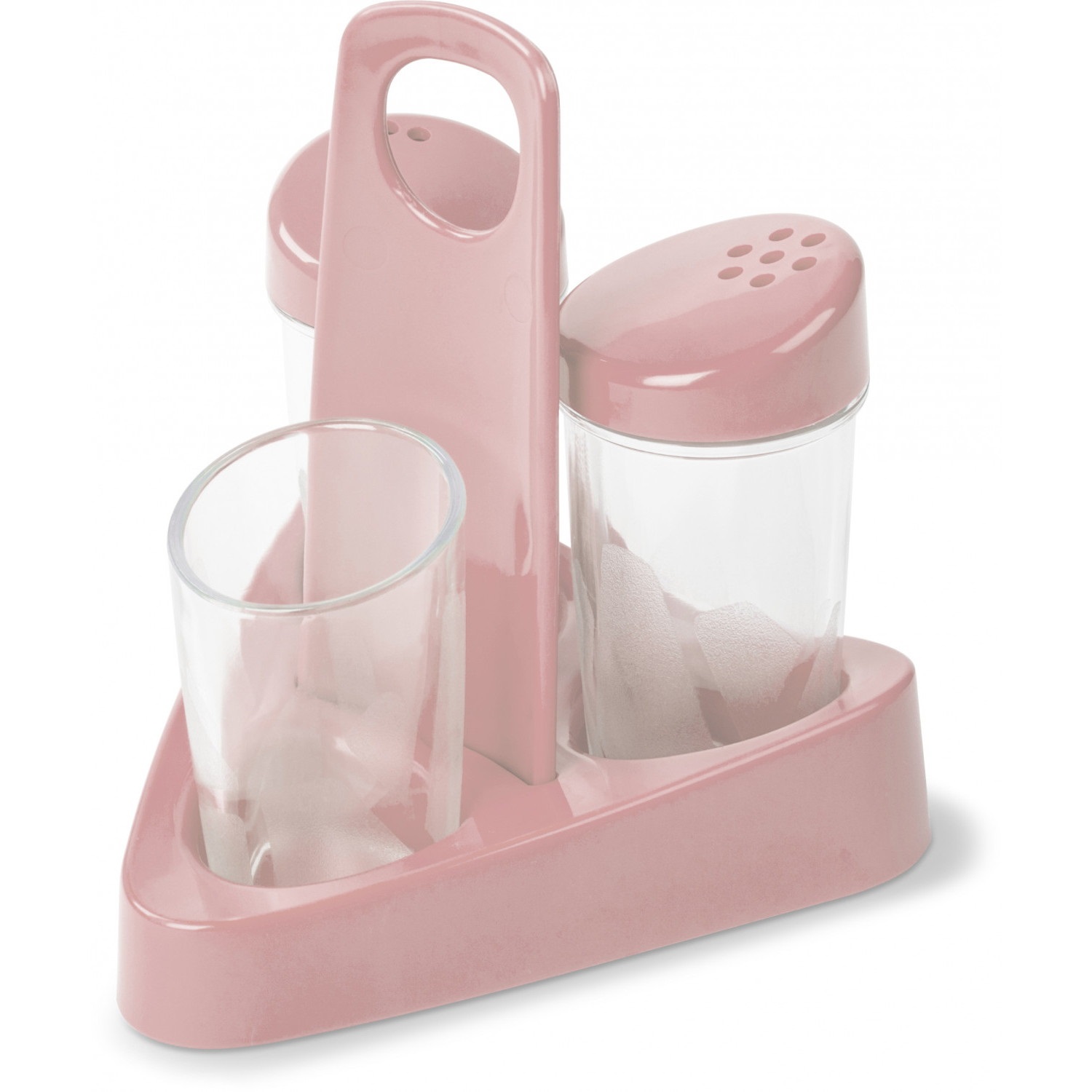 Это небольшой набор с емкостями для хранения разных по типу специй. Включает солонку, перечницу и стаканчик для зубочисток. Емкости устанавливаются на подставку, имеющую ручку для удобства переноски.